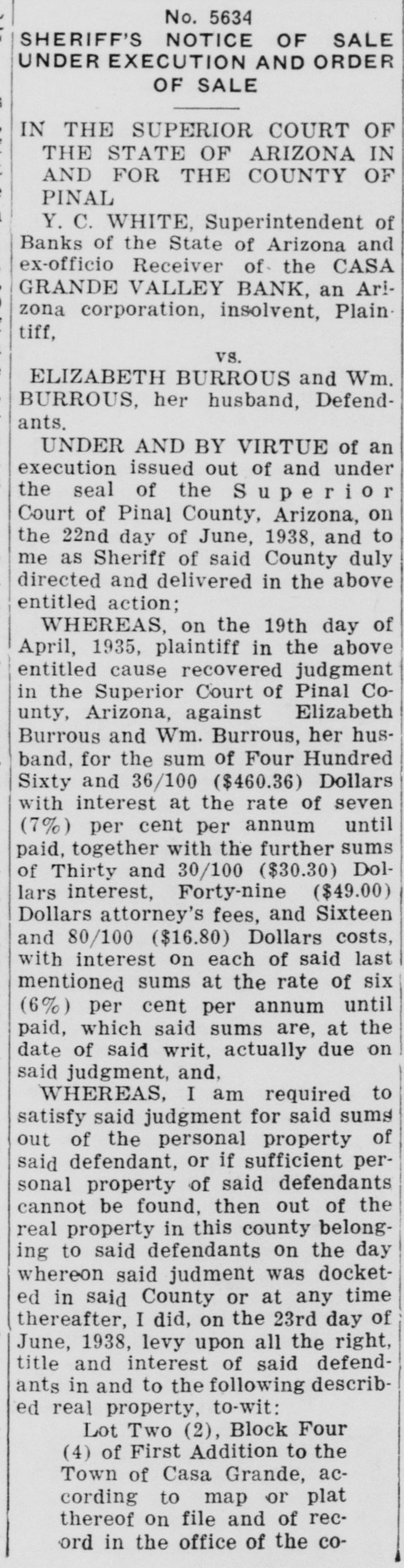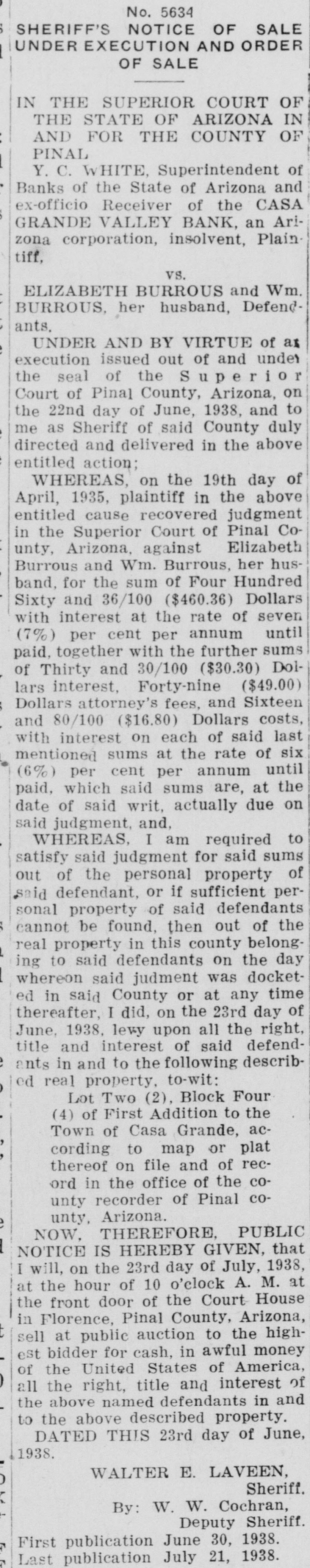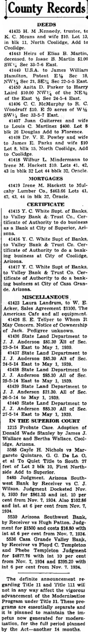 County Records DEEDS 41435 H. M Kennedy, trustee, to K. C. Means and wife $10. Lot 13, in blk 11. North Coolidge, Add to Coolidge. 41443 Heirs of Elias B. Martin, deceased. to Isaac B. Martin $1.00 SWG Sec 33-7-6 East. 41449 U.S.A. to James William Hamilton, Patent E½ Sec 18. NW½ Sec 21, SE% Sec 22-5-5 East. 41450 Anita D. Parker to Harry Laird $10.00 NW14 of the NE12 of the East ½ Sec 24-5-4 East. 41406 C. C. McMurphy to R. C. Woodruff $10. E 20 acres of W½ SW1/4 Sec 33-5-7 East. 41407 Juan Guiterrez and wife to Louis C. Martinez $400. Lot 8 blk 26 Douglas Add to Florence. 41408 Dr. V. E. Powley and wife to James E. Parks and wife $10 Lot 8, bllk 15. North Coolidge, Add to Coolidge. 41418 Wilbur L. Mindermann to Irene M. Hackett $10. Lots 41, 42, 43 in bblk 32 Lot 44 bblk 32, Oracle. MORTGAGES 41419 Irene M. Hackett to Mulcahy Lumber Co., $463.66 Lots 41, 42, 43, 44 in blk 32. Oracle. CERTIFICATE 41415 Y. C. White Supt. of Banks, to Valley Bank & Trust Co., Certificate of Authority to do business as a Bank at City of Superior, Arizona. 41416 Y. C. White Supt of Banks, to Valley Bank & Trust Co. Certificate of Authority to do a bank. ing business at City of Coolidge, Arizona. 41417 Y. C. White Supt of Banks, to Valley Bank & Trust Co. Certificate of Authority to do a banking business at City of Casa Grande. Arizona. MISCELLANEOUS 41423 Laura Landrum, to W. E. Acker, Sales Agreement $1100. The American Cafe and all equipment. 41426 S. E. Tellyer to Whom It May Concern. Notice of Oownership of Jack. Pedigree unknown. 41436 State Land Department to J. J. Anderson $85.30 All of Sec. 23-5-14 East to May 1. 1939. 41437 State Land Department to J. J. Anderson $85.30 All of Sec. 24-5-14 East to May 1, 1939. 41438 State Land Department to J. J. Anderson $85.30 All of Sec. 25-5-14 East to May 1, 1939. 41439 State Land Department to J. J. Anderson $21.30. All of Sec. 26-5-14 to May 1, 1939. 41440 State Land Department to J. J. Anderson $85.30 All of Sec. 27-5-14 East to May 1, 1939. IN THE SUPERIOR COURT 1215 Probate Case. Adoption of Donald Wade Stanley by James J. Wallace and Bertha Wallace. Coolidge, Arizona. 5588 Gayle H. Nichols VS Margareto Quintaro. G. G. De La O, et al To Quiet Title to South 27 feet of Lot 2 blk 10, First Northside Add to Superior. 5485 Judgment. Arizona Southwest Bank by Receiver vs C. J. Wilson. Judgment Docketed Nov. 9. 1930 for $861.35 and int. 10 per cent from Nov. 7. 1934. Also $102.86 and int. at 6 per cent from Nov. 7, 1934. 5530 Arizona Southwest Bank, by Receiver vs Hugh Patton. Judgment for $1500 and costs $16.80 with int at 6 per cent from Nov. 7, 1934. 5536 Casa Grande Valley Bank, by Receiver vs Floyd C. Templeton and Phebe Templeton Judgment for $4877.76 with int 10 per cent from Nov. 7. 1934 and $395.20 with int 6 per cent from Nov. 7. 1934. The definite announcement regarding Title 11 and Title 111 will not in any way affect the vigorous advancement of the Modernization Program under Title 11. These programs are essentially separate and it is planned to maintain the impetus now generated for modernization, for the full period planned by the Act-another 14 months.
