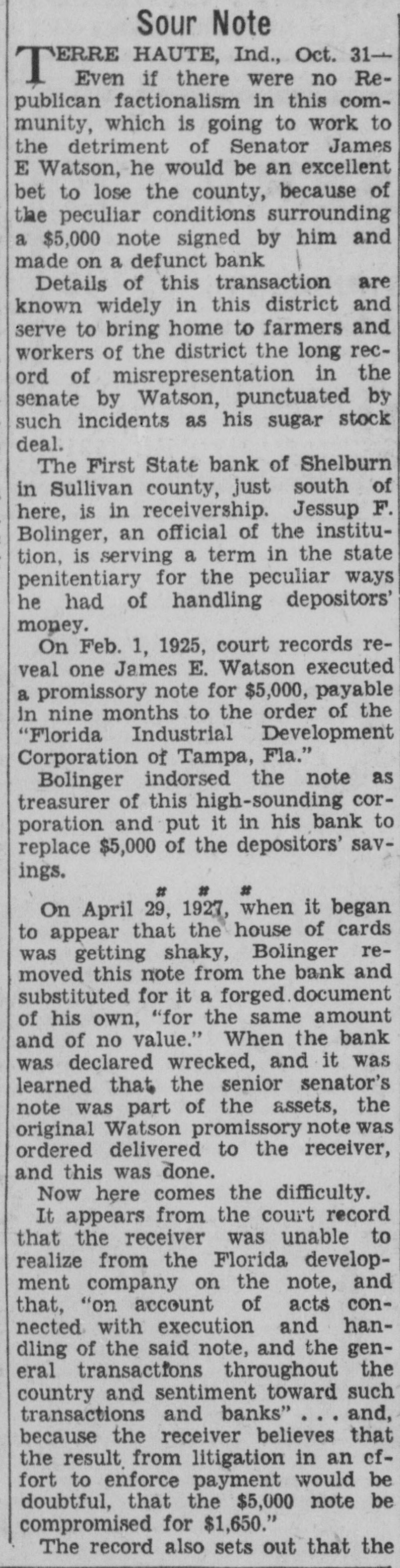 Sour Note ERRE HAUTE, Ind., Oct. 31-Even if there were no ReT publican factionalism in this community, which is going to work to the detriment of Senator James E Watson, he would be an excellent bet to lose the county, because of the peculiar conditions surrounding a $5,000 note signed by him and made on a defunct bank Details of this transaction are known widely in this district and serve to bring home to farmers and workers of the district the long record of misrepresentation in the senate by Watson, punctuated by such incidents as his sugar stock deal. The First State bank of Shelburn in Sullivan county, just south of here, is in receivership. Jessup F. Bolinger, an official of the institution, is serving a term in the state penitentiary for the peculiar ways he had of handling depositors' money. On Feb. 1, 1925, court records reveal one James E. Watson executed a promissory note for $5,000, payable in nine months to the order of the "Florida Industrial Development Corporation of Tampa, Fla." Bolinger indorsed the note as treasurer of this high-sounding corporation and put it in his bank to replace $5,000 of the depositors' savings. # # On April 29, 1927 when it began to appear that the house of cards was getting shaky, Bolinger removed this note from the bank and substituted for it a forged document of his own, "for the same amount and of no value." When the bank was declared wrecked, and it was learned that the senior senator's note was part of the assets, the original Watson promissory note was ordered delivered to the receiver, and this was done. Now here comes the difficulty. It appears from the court record that the receiver was unable to realize from the Florida development company on the note, and that, "on account of acts connected with execution and handling of the said note, and the general transactions throughout the country and sentiment toward such transactions and banks" ... and, because the receiver believes that the result from litigation in an cffort to enforce payment would be doubtful, that the $5,000 note be compromised for $1,650." The record also sets out that the
