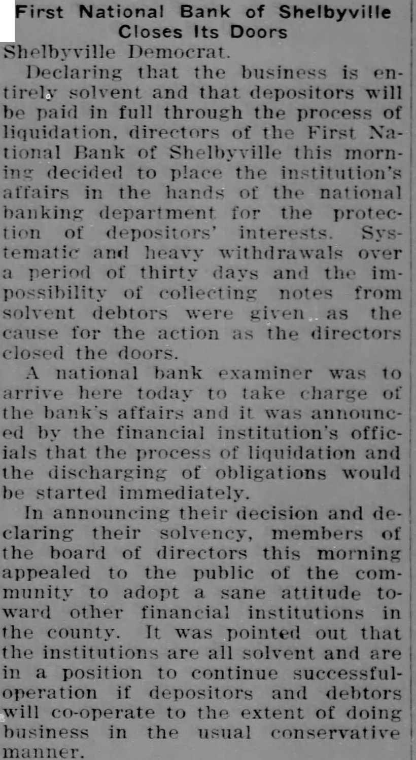 First National Bank of Shelbyville Closes Its Doors Declaring the business and depositors be paid in through the process directors the First tional Bank of this morndecided the institution's the hands the national banking the protecdepositors interests. tematic heavy period and possibility collecting notes from solvent the for action the directors closed the bank examiner was here today take charge and by the financial the and obligations would immediately. decision and claring their solvency, members board directors morning appealed the public the community attitude ward other financial institutions the county. pointed that institutions all solvent and in position continue depositors and debtors the extent doing in usual manner.