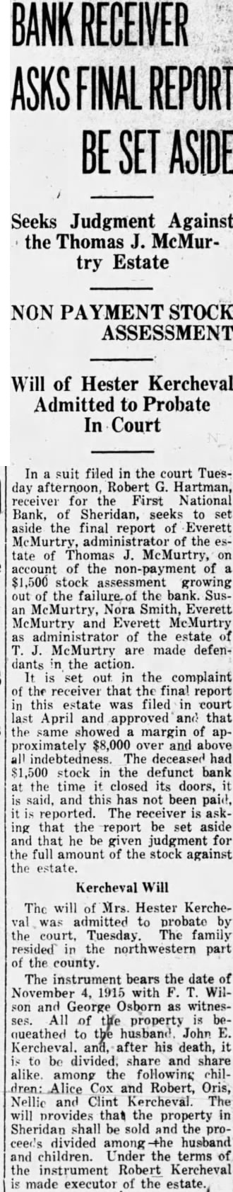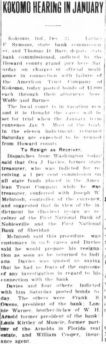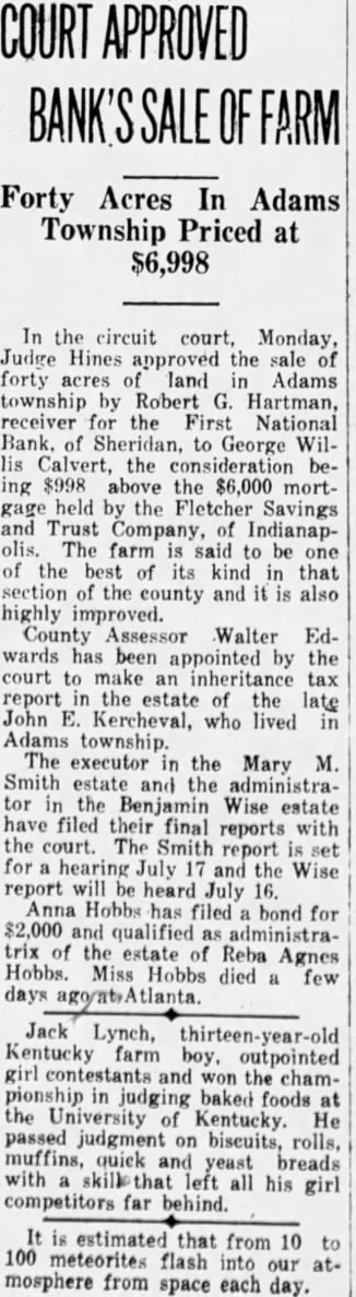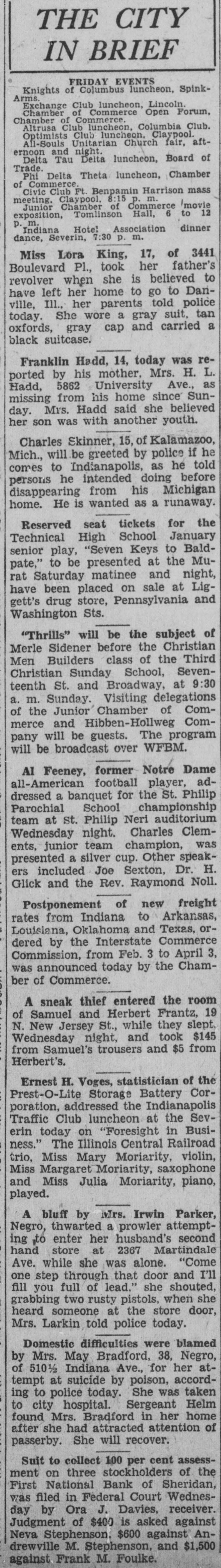 THE CITY IN BRIEF FRIDAY EVENTS Knights of Columbus luncheon, SpinkArms. Exchange Club luncheon, Lincoln. Chamber of Commerce Open Forum, Chamber of Commerce. Altrusa Club luncheon, Columbia Club. Optimists Club luncheon. Claypool. All-Souls Unitarian Church fair, afternoon and night. Delta Tau Delta luncheon, Board of Trade. Phi Delta Theta luncheon, Chamber of Commerce Civic Club Ft. Benpamin Harrison mass meeting. Claypool, 8:15 p. m. Junior Chamber of Commerce movie exposition, Tomlinson Hall, 6 to 12 p. m. Indiana Hotel Association dinner dance, Severin, 7:30 p. m. Miss Lora King, 17, of 3441 Boulevard Pl., took her father's revolver when she is believed to have left her home to go to Danville, Ill., her parents told police today. She wore a gray suit, tan oxfords, gray cap and carried a black suitcase. Franklin Hadd, 14, today was reported by his mother, Mrs. H. L. Hadd, 5862 University Ave., as missing from his home since Sunday. Mrs. Hadd said she believed her son was with another youth. Charles Skinner, 15, of Kalamazoo, Mich., will be greeted by police if he comes to Indianapolis, as he told persons he intended doing before disappearing from his Michigan home. He is wanted as a runaway. Reserved seat tickets for the Technical High School January senior play, "Seven Keys to Baldpate," to be presented at the Murat Saturday matinee and night, have been placed on sale at Liggett's drug store, Pennsylvania and Washington Sts. "Thrills" will be the subject of Merle Sidener before the Christian Men Builders class of the Third Christian Sunday School, Seventeenth St. and Broadway, at 9:30 a. m. Sunday. Visiting delegations of the Junior Chamber of Commerce and Hibben-Hollweg Company will be guests. The program will be broadcast over WFBM. Al Feeney, former Notre Dame all-American football player, addressed a banquet for the St. Philip Parochial School championship team at St. Philip Neri auditorium Wednesday night. Charles Clements, junior team champion, was presented a silver cup. Other speakers included Joe Sexton, Dr. H. Glick and the Rev. Raymond Noll. Postponement of new freight rates from Indiana to Arkansas, Louisiana, Oklahoma and Texas, ordered by the Interstate Commerce Commission, from Feb. 3 to April 3, was announced today by the Chamber of Commerce. A sneak thief entered the room of Samuel and Herbert Frantz, 19 N. New Jersey St., while they slept. Wednesday night, and took $145 from Samuel's trousers and $5 from Herbert's. Ernest H. Voges, statistician of the Prest-O-Lite Storage Battery Corporation, addressed the Indianapolis Traffic Club luncheon at the Severin today on "Foresight in Business." The Illinois Central Railroad trio, Miss Mary Moriarity, violin, Miss Margaret Moriarity, saxophone and Miss Julia Moriarity, piano, played. A bluff by Mrs. Irwin Parker, Negro, thwarted a prowler attempting to enter her husband's second hand store at 2367 Martindale Ave. while she was alone. "Come one step through that door and I'll fill you full of lead." she shouted, grabbing two rusty pistols, when she heard someone at the store door, Mrs. Larkin told police today. Domestic difficulties were blamed by Mrs. May Bradford, 38, Negro, of 5101/2 Indiana Ave., for her attempt at suicide by poison, according to police today. She was taken to city hospital. Sergeant Helm found Mrs. Bradford in her home after she had attracted attention of passerby. She will recover. Suit to collect 100 per cent assessment on three stockholders of the First National Bank of Sheridan, was filed in Federal Court Wednesday by Ora J. Davies, receiver. Judgment of $400 is asked against Neva Stephenson. $600 against Andrewville M. Stephenson, and $1,500 against Frank M. Foulke.