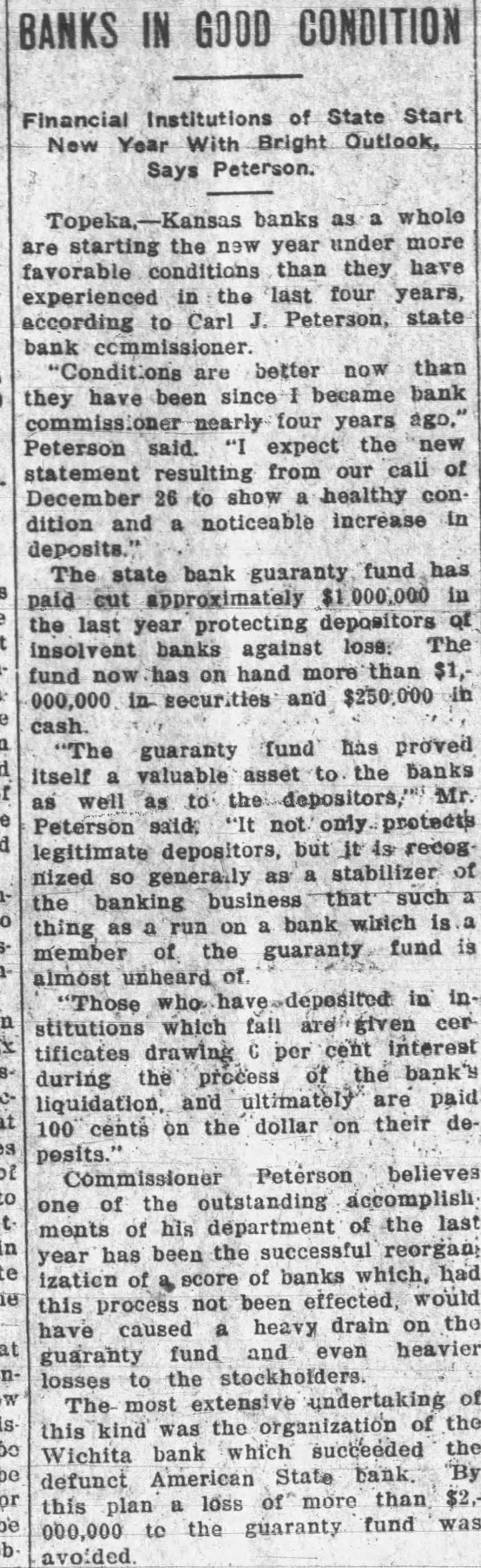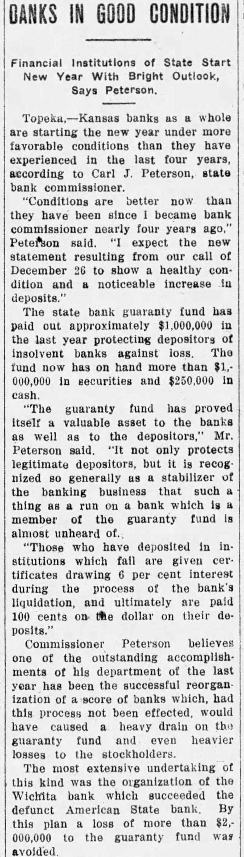 In an interview given the Wichita Eagle recently M. B. Light, president of the State Reserve bank of Wichita, defends the Kansas bank law and declares that it is in no danger of being repealed. Attacks on the law, such as appeared in the Kansas City Star and other newspapers recently, are not based on real facts but are mere garbling of figures intended to mislead the public. Mr. Light, in the interview, said: "It is regrettable that certain statements recently published in daily papers, emanating from members of the legislature, adversely criticising the state guaranty law have been thus published without giving full, complete and truthful statements regarding the condition of the state guaranty fund. These derogatory accounts are being copied in many papers and this is doing the guaranteed banks great injustice. "When it is borne in mind that criticism against this beneficent are made by opponents of the guaranty fund law and by men who have for years fought in many ways to destroy the same, it removes largely the force of their argument. Such is the case. The other day Senator Snyder, national banker of Leavenworth, made statement the guaranty fund was insolvent for the reason that there is $4,000,000 in outstanding claims against the fund. This same misleading statement was repeated by tional banker from Ashland in the house the next day. Both failed to take into consideration assets in all these failed banks that are being collected and will be collected in the future to be applied as dividends and credited on these outstanding guaranty certificates. Not long ago the bank commissioner's office was asked for an estimate of how much would likely be collected by receivers and turned in for credit on outstanding guaranty The inquiry was passed on to each receiver and careful estimate made, with the reply that approximately 60 per cent of the assets of these failed banks would be collected and turned in. Thi makes tremendous difference in the status of the fund and had these natienal bankers been fair they would have acknowledged that large credits would surely be collected and turned in credits on guaranty fund guaranty law will not be pealed. At almost every session of the legislature some enemy of the law introduces bill to repeal it. This was done this session of the legislature. but the other day it was disposed of and didn't even get to the floor of the house, where the bill was introduced. The guaranty law the statute books to stay. It is abso luely sound and if it had not been that the world war created situation no one could foresee and no one could estimate, it would not have been attacked in this manner, as it has been in the last few days. The world war brought upon the banks of Kansas situation that without the guaranty law to create stability would have created panic heretofore unknown, and banks, national and state, would have gone down by the score. The situation could not have been saved here in Kansas, with no runs or trouble in any other bank, except from the knowledge that the guaranty fund was able to meet the demand. The situation at Wichita was striking example of the efficacy of the guaranty law. The American State bank failed and consternation reigned supreme. The shock of the whole situation was felt intensely, but it did not start run on single bank because the public knew that it was guaranteed bank and the losses would be paid by the guaranty fund. It seems to me that in justice to the situation. some one should rise in the legislature and dafend the greatest law for the benefit of the humble depositor ever placed upon the statute books of Kansas and not allow enemies and adverse criticism to be broadeasted in the state test." and without the state without pro-