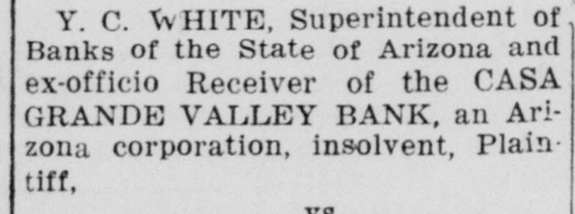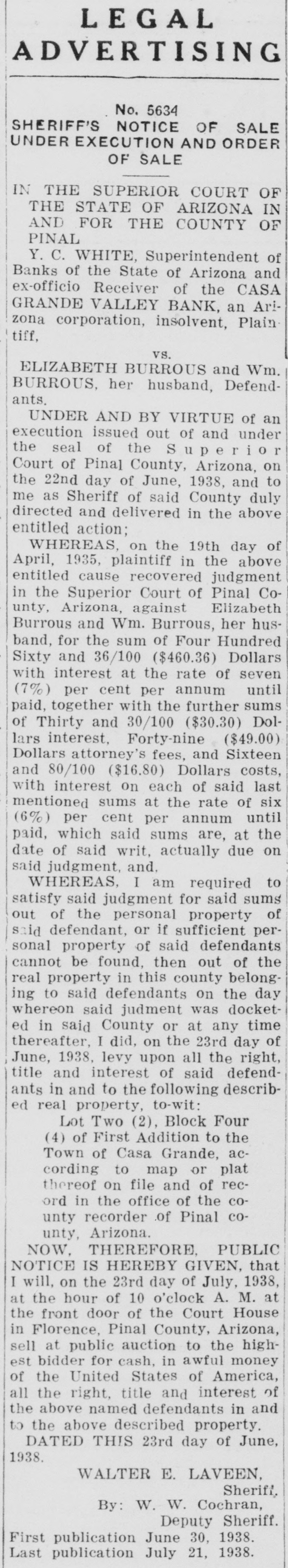 LEGAL ADVERTISING No. 5634 SHERIFF'S NOTICE OF SALE UNDER EXECUTION AND ORDER OF SALE IN THE SUPERIOR COURT OF THE STATE OF ARIZONA IN AND FOR THE COUNTY OF PINAL Y. C. WHITE, Superintendent of Banks of the State of Arizona and ex-officio Receiver of the CASA GRANDE VALLEY BANK, an Ari- zona corporation, insolvent, Plain- tiff, vs. ELIZABETH BURROUS and Wm. BURROUS, her husband, Defend- ants. UNDER AND BY VIRTUE of an execution issued out of and under the seal of the Superior Court of Pinal County, Arizona, on the 22nd day of June, 1938, and to me as Sheriff of said County duly directed and delivered in the above entitled action; WHEREAS, on the 19th day of April, 1935, plaintiff in the above entitled cause recovered judgment in the Superior Court of Pinal Co- unty, Arizona, against Elizabeth Burrous and Wm. Burrous, her hus- band, for the sum of Four Hundred Sixty and 36/100 ($460.36) Dollars with interest at the rate of seven (7%) per cent per annum until paid, together with the further sums of Thirty and 30/100 ($30.30) Dol- lars interest, Forty-nine ($49.00) Dollars attorney's fees, and Sixteen and 80/100 ($16.80) Dollars costs, with interest on each of said last mentioned sums at the rate of six (6%) per cent per annum until paid, which said sums are, at the date of said writ, actually due on said judgment, and, WHEREAS, I am required to satisfy said judgment for said sums out of the personal property of said defendant, or if sufficient per- sonal property of said defendants cannot be found, then out of the real property in this county belong- ing to said defendants on the day whereon said judment was docket- ed in said County or at any time thereafter, I did, on the 23rd day of June, 1938, levy upon all the right, title and interest of said defend- ants in and to the following describ- ed real property, to-wit: Lot Two (2), Block Four (4) of First Addition to the Town of Casa Grande, ac- cording to map or plat thereof on file and of rec- ord in the office of the co- unty recorder of Pinal co- unty, Arizona. NOW, THEREFORE, PUBLIC NOTICE IS HEREBY GIVEN, that I will, on the 23rd day of July, 1938, at the hour of 10 o'clock A. M. at the front door of the Court House in Florence, Pinal County, Arizona, sell at public auction to the high- est bidder for cash, in awful money of the United States of America, all the right, title and interest of the above named defendants in and to the above described property. DATED THIS 23rd day of June, 1938. WALTER E. LAVEEN, Sheriff, By: W. W. Cochran, Deputy Sheriff. First publication June 30, 1938. Last publication July 21, 1938.