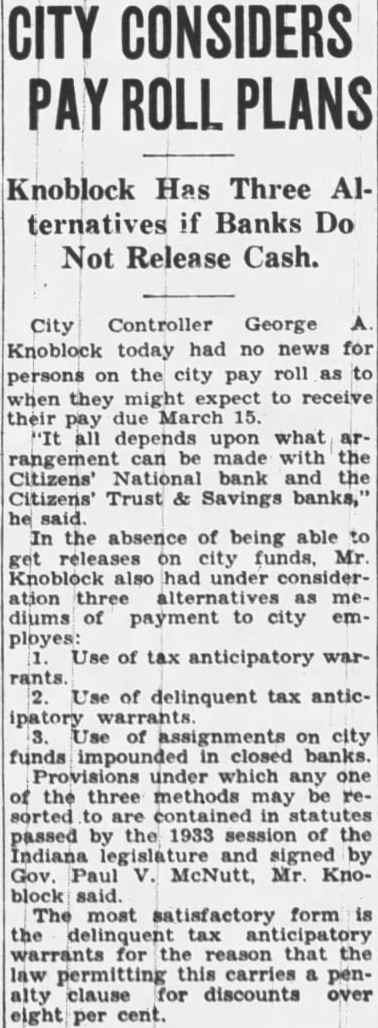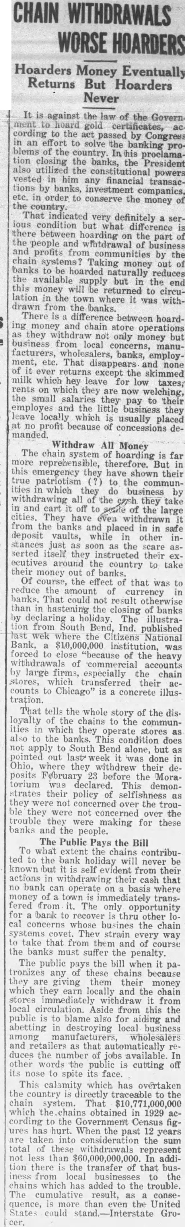 It is against the law of the Government to hoard gold according to the act passed by Congress in an effort to solve the banking problems of the country. In this proclamation closing the banks, the President also utilized the constitutional powers vested in him any financial transactions by banks, investment companies, the etc. in order to conserve the money of country. That indicated very definitely a serious condition but what difference is there between hoarding on the part of the people and wfhtdrawal of business and profits from communities by the chain systems? Taking money out of banks to be hoarded naturally reduces the available supply but in the end this money will be returned to circulation in the town where it was withdrawn from the banks. There is difference between hoarding money and chain store operations as they withdraw not only money but business from local concerns, manufacturers, wholesalers, banks, employment, etc. That disappears and none of it ever returns except the skimmed milk which hey leave for low taxes, rents on which they are now welching, the small salaries they pay to their employes and the little business they leave locally which is usually placed at no profit because of concessions demanded.