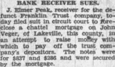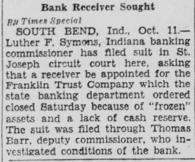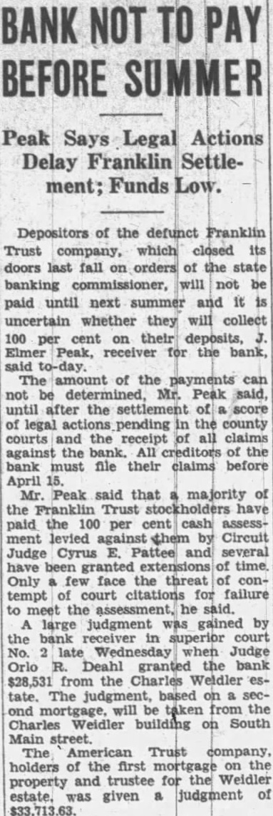 Always He Says A few minutes later the court asked Mr. Parker whether the Franklin Trust Company was ever solvent. "That bank was never solvent. the attorney for the receiver answered. fraud from its very More than one-half the $100,000 italization the bank of watered for was no security only time the full italization on hand was for an hour two the day the bank opened This, he said, was in money borrowed deceive the bank and was taken away after spectors they He that investigation has explained that only about of the shown capital was sold and the $55,000 was out whose notes for on deposit in bank Subsequent revealed. he said, that many the persons who signed these notes supposedly had purchase the not stock and that their forged and on other notes were found to be fictitious, he alleged. Parker charged that Matthew Caldwell, president the was by his sign note told for fifty of carry it in his name until such time could be unloaded on some else that in the the and would carried the books charged to fixtures. receiver's attorney said that he has statements from Caldwell together with photostatic of other illegal operations and ready time to present them before at any a grand jury Alleges Illegal Borrowing He also said that officials the bank money from the institution on notes that were not signed by the directors as is required by He said such bor rowing offense in Indiana. During its operation of three years of $35,000 year. the Frank lin issued between $160,000 and $170,000 worth of bonds, it certificates of that existed the end today's hearing Judge Pyle asserted that he would down bottom of this thing complete audit of bank's and receivership operation by Chambers It was indicated that the would be set for trial an early date, probably in January.