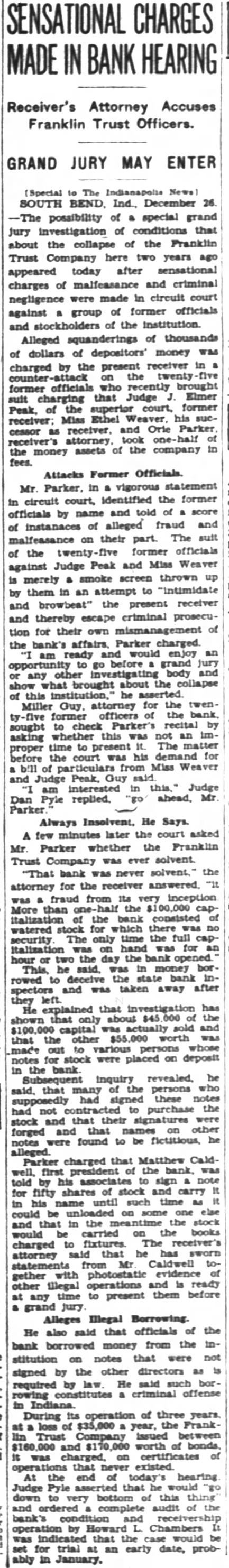 SOUTH BEND, Ind., December 26. The possibility of special grand jury investigation of that about the collapse of the Franklin Trust Company here two years ago appeared today after sensational charges of malfeasance and criminal negligence were made circuit court against group of former officials and stockholders of the institution Alleged of thousands of dollars of money was the present receiver in charged officials who recently brought former suit that Judge Elmer Peak, former receiver Miss Ethel Weaver. his successor as receiver. and Orie Parker receiver's attorney the money assets of the company fees.