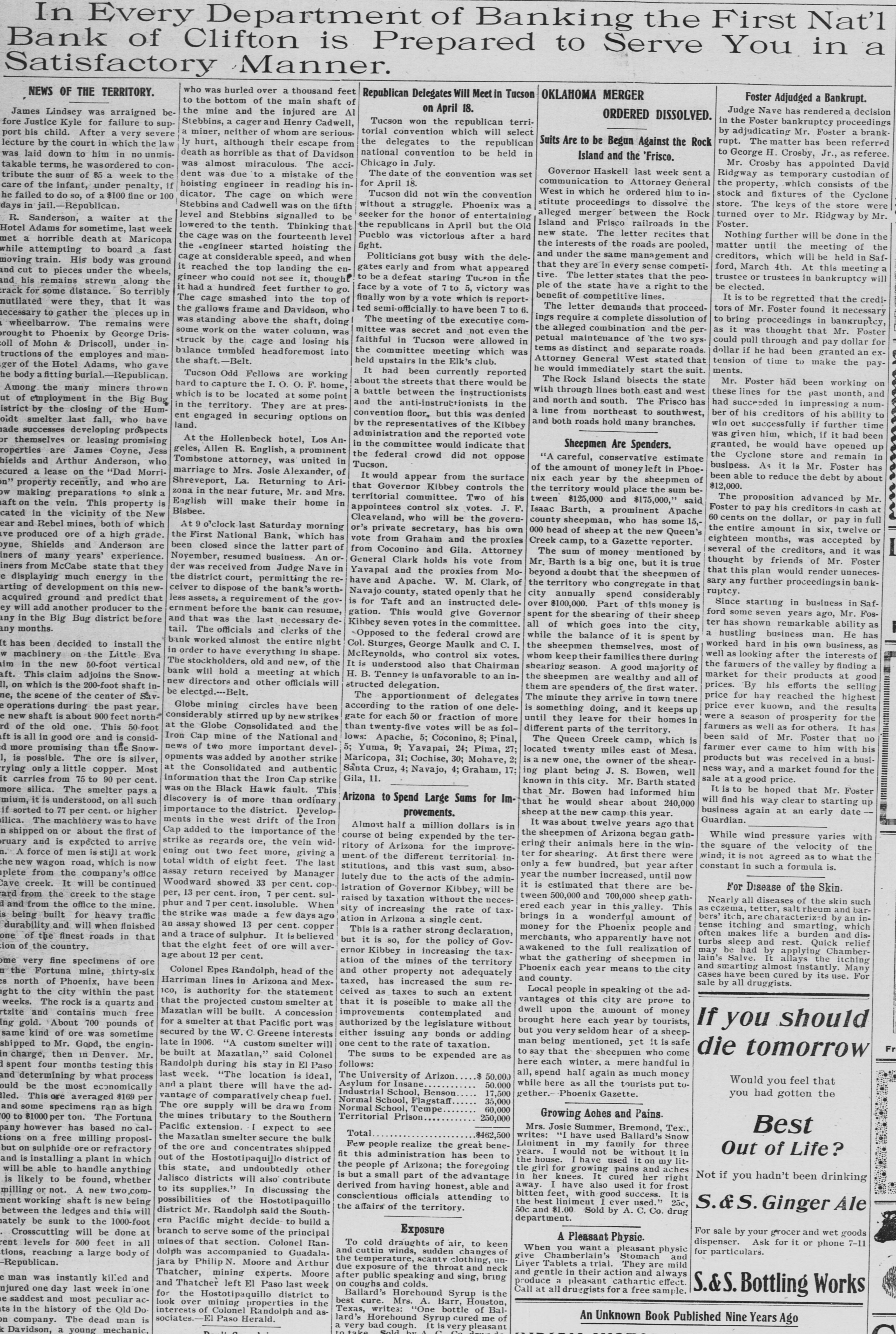In Every Department of Banking the First Nat'l Bank of Clifton is Prepared to Serve You in a Satisfactory Manner. who was hurled over a thousand feet NEWS OF THE TERRITORY. Republican Delegates Will Meet in Tucson OKLAHOMA MERGER Foster Adjudged a Bankrupt. to the bottom of the main shaft of on April 18. Judge Nave has rendered a decision the mine and the injured are Al James Lindsey was arraigned beORDERED DISSOLVED. Tucson won the republican terriin the Foster bankruptcy proceedings Stebbins, a cager and Henry Cadwell, fore Justice Kyle for failure to suptorial convention which will select a miner, neither of whom are seriousby adjudicating Mr. Foster a brankport his child. After a very severe rupt. The matter has been referred Suits Are to be Begun Against the Rock the delegates to the republican lecture by the court in which the law ly hurt, although their escape from national convention to be held in was laid down to him in no unmisdeath as horrible as that of Davidson to George H. Crosby, Jr., as referee. Island and the 'Frisco. Chicago in July. was almost miraculous. The acciMr. Crosby has appointed David takable terms, he wasordered to conGovernor Haskell last week sent a The date of the convention was set dent was due to a mistake of the tribute the sun of $5 a week to the Ridgway as temporary custodian of communication to Attorney General for April 18. the property, which consists of the hoisting engineer in reading his incare of the infant, under penalty, if West in which he ordered him to inTucson did not win the convention dicator. The cage on which were he failed to do so, of a $100 fine or 100 stock and fixtures of the Cyclone stitute proceedings to dissolve the Stebbins and Cadwell was on the fifth store. The keys of the store were without a struggle. Phoenix was a days in jail.-Republican. alleged merger between the Rock seeker for the honor of entertaining level and Stebbins signalled to be turned over to Mr. Ridgway by Mr. Rv. Sanderson, a waiter at the Island and Frisco railroads in the Foster. the republicans in April but the Old lowered to the tenth. Thinking that Hotel Adams for sometime, last week new state. The letter recites that Pueblo was victorious after a hard Nothing further will be done in the the cage was on the fourteenth level met a horrible death at Maricopa fight. the interests of the roads are pooled, matter until the meeting of the the engineer started hoisting the while attempting to board a fast and under the same management and creditors, which will be held in SafPoliticians got busy with the delecage at considerable speed, and when moving train. His body was ground that they are in every sense competigates early and from what appeared ford, March 4th. At this meeting a it reached the top landing the enand cut to pieces under the wheels, tive. The Jetter states that the peoto be a defeat staring Tucson in the gineer who could not see it, thought trustee or trustees in bankruptcy will and his remains strewn along the be elected. ple of the state have a right to the face by a vote of to 5, victory was it had a hundred feet further to go. track for some distance. So terribly benefit of competitive lines. It is to be regretted that the credifinally won by a vote which is reportThe cage smashed into the top of mutilated were they, that it was The letter demands that proceedted semi-officially to have been 7 to 6. the gallows frame and Davidson, who tors of Mr. Foster found it necessary necessary to gather the pieces up in ings require a complete dissolution of The meeting of the executive comwas standing above the shaft, doing to bring proceedings in bankruptcy, e wheelbarrow. The remains were the alleged combination and the permittee was secret and not even the as it was thought that Mr. Foster some work on the water column, was brought to Phoenix by George Drispetual maintenance of 'the two sysfaithful in Tucson were allowed in struck by the cage and losing his could pull through and pay dollar for oll of Mohn & Driscoll, under intems as distinct and separate roads. balance tumbled headforemost into dollar if he had been granted an exthe committee meeting which was tructions of the employes and manAttorney General West stated that the shaft.-Belt held upstairs in the Elk's club. tension of time to make the payger of the Hotel Adams, who gave ments. he would immediately start the suit. It had been currently reported Tucson Odd Fellows are working he body a fitting burial. -Republican. The Rock Island bisects the state about the streets that there would be Mr. Foster had been working on hard to capture the O. O. F. home, Among the many miners thrown with through lines both east and west a battle between the instructionists these lines for the past month, and which is to be located at some point ut of employment in the Big Bug and north and south. The Frisco has and the anti-instructionists in the had succeeded in impressing a numin the territory. They are at presistrict by the closing of the Huma line from northeast to southwest, convention floor, but this was denied ber of his creditors of his ability to ent engaged in securing options on oidt smelter last fall, who bave and both roads hold many branches. land. win out successfully if further time by the representatives of the Kibbey ade successes developing prospects was given him, which, if it had been administration and the reported vote At the Hollenbeck hotel, Los Anor themselves or leasing promising in the committee would indicate that Sheepmen Are Spenders. granted, he would have opened up geles, Allen R. English, a prominent roperties are James Coyne, Jess the Cyclone store and remain in the federal crowd did not oppose "A careful, conservative estimate Tombstone attorney, was united in hields and Arthur Anderson, who Tucson. business. As it is Mr. Foster has of the amount of moneyl in Phoeecured a lease on the "Dad Morrimarriage to Mrs. Josie Alexander, of It would appear from the surface be