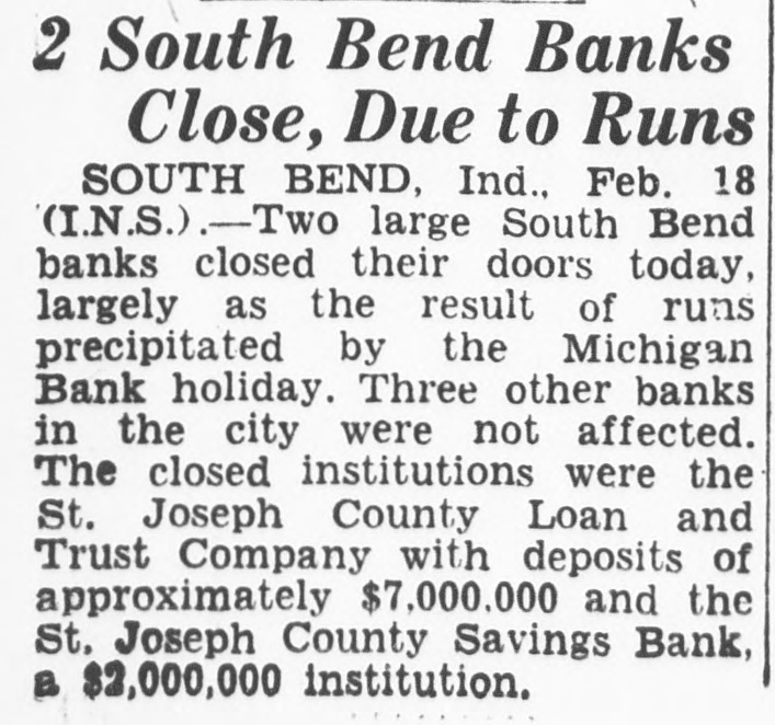 2 South Bend Banks Close, Due to Runs SOUTH BEND, Ind.. Feb. 18 (I.N.S.) .Two large South Bend banks closed their doors today, largely as the result of runs precipitated by the Michigan Bank holiday. Three other banks in the city were not affected. The closed institutions were the St. Joseph County Loan and Trust Company with deposits of approximately $7,000,000 and the St, Joseph County Savings Bank, a $2,000,000 institution.