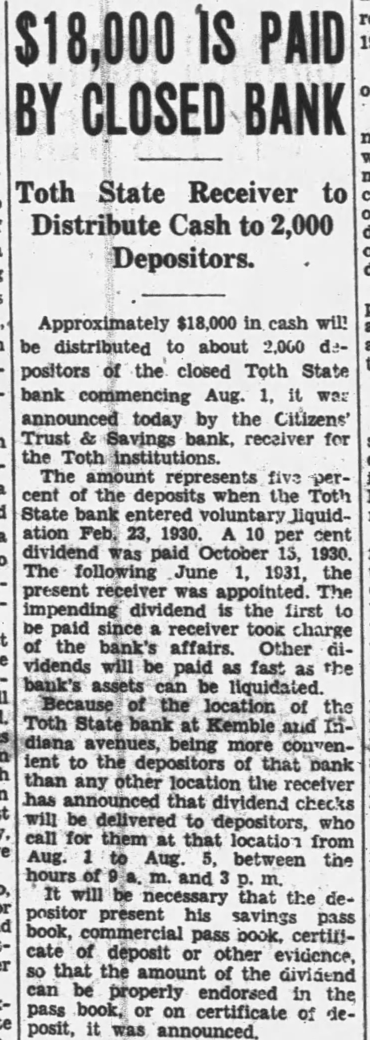 IS PAID $18,000 CLOSED BANK Toth State Receiver to Distribute Cash to 2,000 Depositors. Approximately $18,000 in cash will distributed to about 2,000 positors of the closed Toth State bank Aug. was announced today by the Citizens' Trust Savings bank, receiver for the Toth institutions. amount represents five perof the deposits when the Toth State liquidation Feb. 23, 1930. 10 per was 1930. The June 1931, the present receiver The the first paid since charge bank's affairs. Other vidends will paid fast as the bank's assets can be liquidated. Because the location Toth State bank at Kemble and Indiana avenues, being convenient to the depositors of that bank than any other location the receiver announced that dividend checks will be delivered to depositors, who for them that location from Aug. Aug. between the be that the depresent his savings book, pass book, certificate of deposit other evidence, that the of the dividend can be endorsed in the pass book, on certificate of deposit, it was announced.