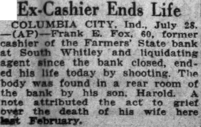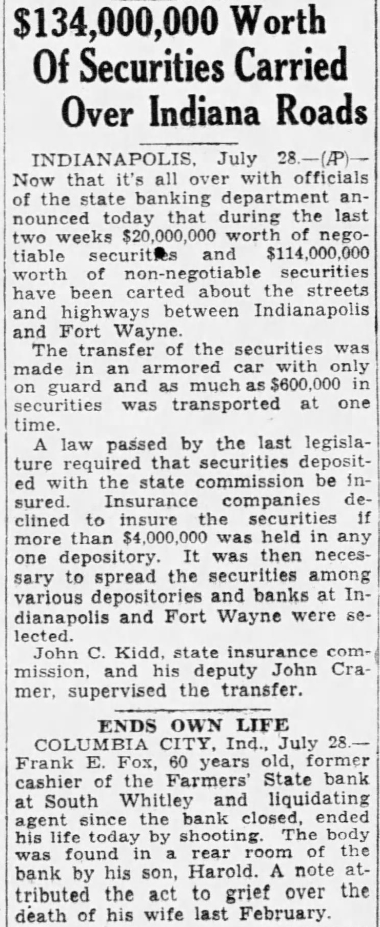 $134,000,000 Worth Of Securities Carried Over Indiana Roads INDIANAPOLIS. July 28 Now that it's all over with officials of the state banking department announced today that during the last two weeks $20,000,000 worth of negotiable securities and $114,000,000 worth of non-negotiable securities have been carted about the streets and highways between Indianapolis and Fort The transfer of the securities was made in an armored car with only on guard and as much $600,000 in securities was transported at one time. A law passed by the last legislature required that securities deposited with the state commission be insured Insurance companies declined to insure the securities if more than $4,000,000 was held in any one depository It was then necessary spread the securities among various depositories and banks at Indianapolis and Fort Wayne were selected. John C. Kidd. state insurance commission. and his deputy John Cra mer, supervised the transfer. ENDS OWN LIFE COLUMBIA CITY, Ind., July 28 Frank E. Fox, 60 years old, former cashier of the Farmers' State bank at South Whitley and liquidating agent since the bank closed, ended his today by shooting The was found in rear room of bank by his son, Harold. A note tributed the act to grief over death of his wife last February