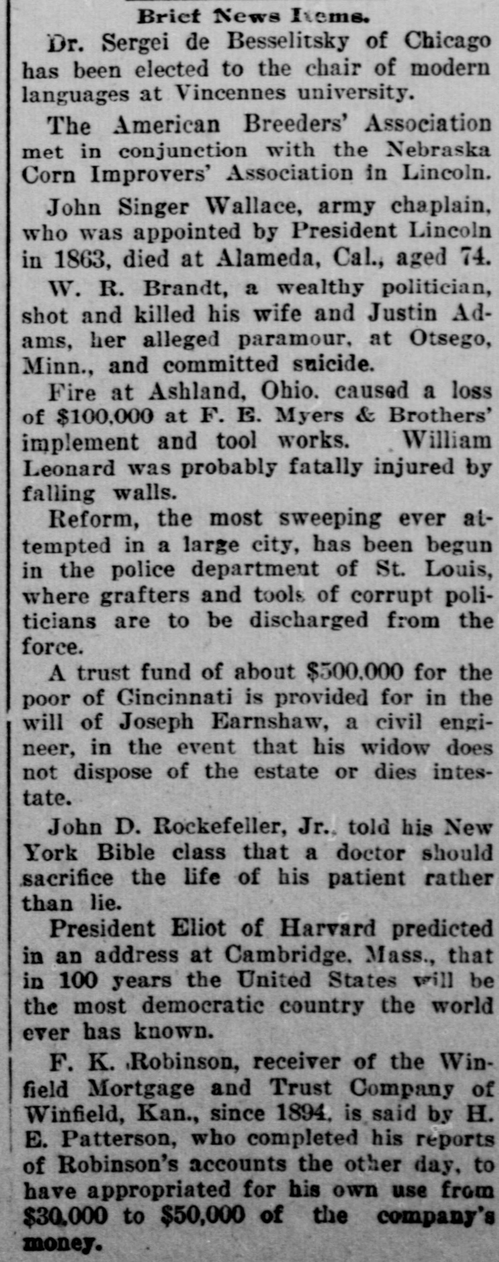 Brief News Items. Dr. Sergei de Besselitsky of Chicago has been elected to the chair of modern languages at Vincennes university. The American Breeders' Association met in conjunction with the Nebraska Corn Improvers' Association in Lincoln. John Singer Wallace, army chaplain, who was appointed by President Lincoln in 1863, died at Alameda, Cal., aged 74. W. R. Brandt, a wealthy politician, shot and killed his wife and Justin Adams, her alleged paramour, at Otsego, Minn., and committed suicide. Fire at Ashland, Ohio, caused a loss of $100,000 at F. E. Myers & Brothers' implement and tool works. William Leonard was probably fatally injured by falling walls. Reform, the most sweeping ever attempted in a large city, has been begun in the police department of St. Louis, where grafters and tools of corrupt politicians are to be discharged from the force. A trust fund of about $500,000 for the poor of Cincinnati is provided for in the will of Joseph Earnshaw, a civil engideer, in the event that his widow does not dispose of the estate or dies intescate. John D. Rockefeller, Jr., told his New York Bible class that a doctor should sacrifice the life of his patient rather than lie. President Eliot of Harvard predicted n an address at Cambridge, Mass., that n 100 years the United States will be :he most democratic country the world ever has known. F. K. Robinson, receiver of the Winield Mortgage and Trust Company of Winfield, Kan., since 1894, is said by H. E. Patterson, who completed his reports of Robinson's accounts the other day, to ave appropriated for his own use from $30,000 to $50,000 of the company's money.
