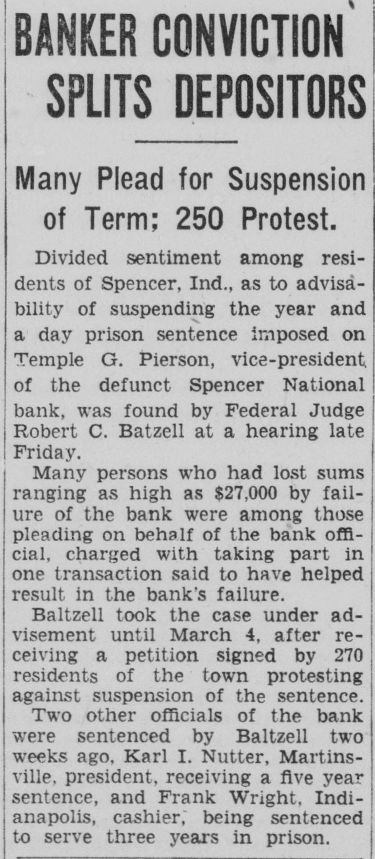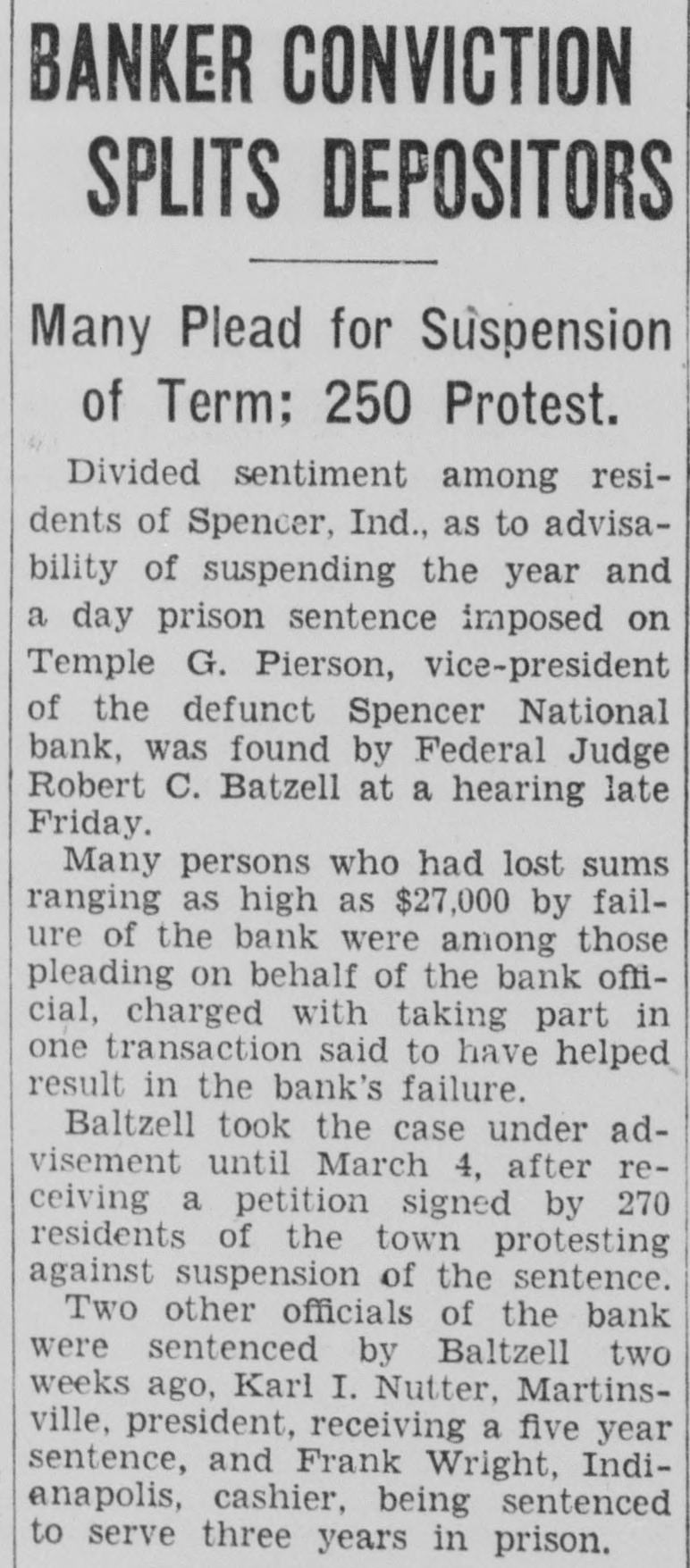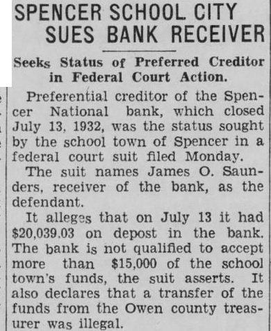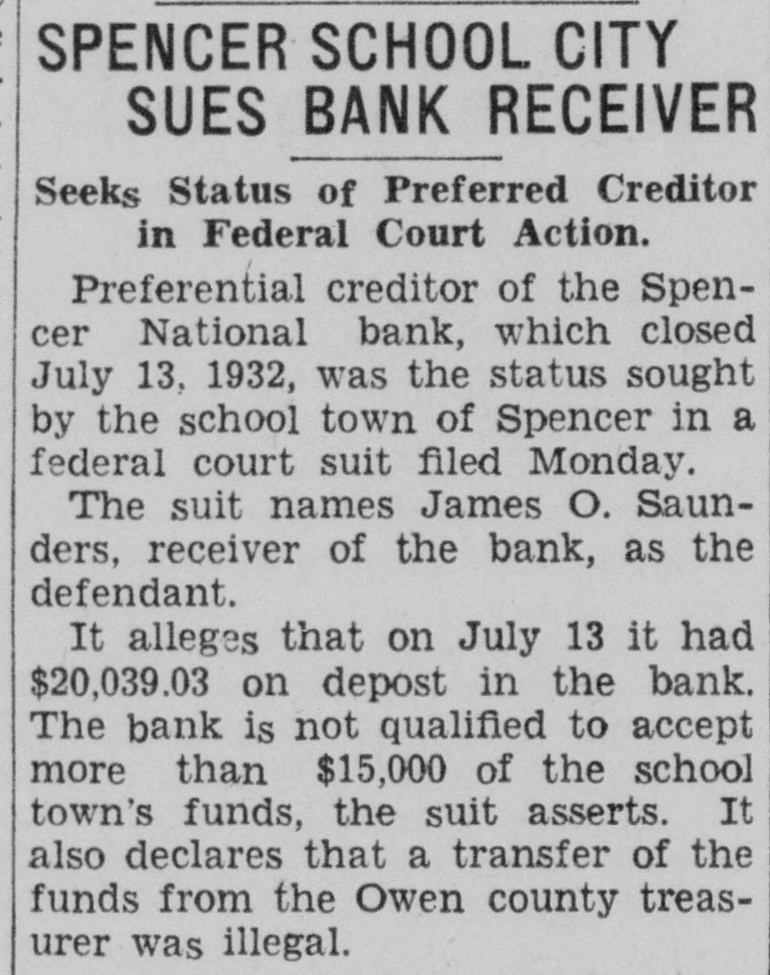 Owen County Commissioners have filed a complaint on depository bond Owen Circuit Court against Karl Nutter, Charles Abott. Edward Avery, Sherman Cunningham of Martinsville, Tempel Pierson, Rufus H. Cline Gottlieb Rentschler of Owen county. The complaint alleges that on July 13, 1932 the Spencer National Bank suspended orperation as banking institution without returning to the county all money deposited therein. The complaint also alleges that the bank was declared a public fund depository in accordance with Indiana laws. bond was signed to this effect by the above named defendant officers as surety. The counalleges that on July 13, the county funds amounted to something over $52,700. The county asks judgment in the sum of $60,000.00.