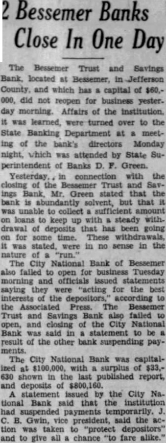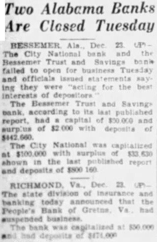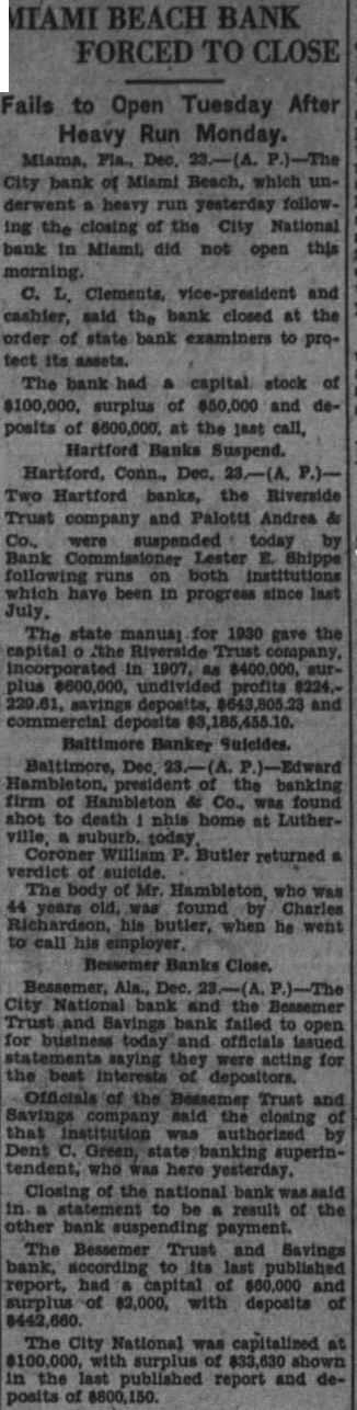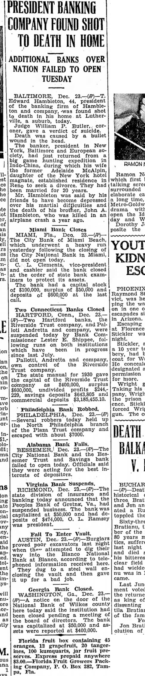 PRESIDENT BANKING COMPANY FOUND SHOT TO DEATH IN HOME ADDITIONAL BANKS OVER NATION FAILED TO OPEN TUESDAY BALTIMORE, Dec. 23.-(P)-T. Edward Hambleton, 44, president of the banking firm of Hambleton and company, was found shot death in his home at Luthersuburb, today. Judge William Butler, corgave verdict suicide. was caused by a bullet wound the head. The banker, president in New York, Baltimore and European SOciety, had just returned from big game hunting expedition in during which his wife the former Adelaide McAlpin, daughter of the New York hotel magnate, established in Reno to seek They had been married for 20 years. Mr. Hambleton was said by his friends to have become depressed over his martial difficulties and the death of his brother, John Hambleton, who was killed in an airplane crash year ago. Miami Bank Closes MIAMI, Fla., Dec. The City Bank of Miami Beach, which heavy run following the closing of the City National Bank in Miami, did not open today. Clements, vice-president and cashier said the bank closed the order of state bank examiners to protect its assets. The bank had capital stock of $100,000, surplus $50,000 and deposits of $600,000 at the last call. Two Connecticut Banks Closed HARTFORD, Dec. Hartford banks, the Riverside Trust company, and Palloti Andretta and company, were suspended today by Bank Commissioner Lester Shippee, following runs on both institutions which have been in progress since last July. Pallotti, Andretta and company, control of the Riverside own Trust company. The state for 1930 gave the capital of the Riverside Trust company $400,000, surplus $600,000, undivided profits $244,229, savings deposits $643,805 and commercial deposits Philadelphia Bank Robbed. PHILADELPHIA, Dec. -Several robbers today held the North branch the Plaza Trust company and escaped with about $7000. Alabama Bank Fails. BESSEMER, Dec. City National Bank and the Bessemer Trust and Savings bank failed to open today. Officials said they were acting for the best interests of depositors. Virginia Bank Suspends. RICHMOND, Dec. state division of insurance banking today announced that the Peoples Bank of Gretna, had suspended business. The bank capitalized $50,000 and had deposits of $474,000. O. Ramsey was president. Fall To Enter Vault. AUSTIN, Dec. proved poor excavators last night attempted to dig their when way into the Blanco National Bank at Blanco, according to telephoned information received here. They dug to steel wall envault and then gave closing it up for bad job. Georgia Bank Closed. WASHINGTON, Ga., Dec. (AP)-A notice on the door of the National Bank of Wilkes county here today said the institution had been closed pending a meeting of the board of directors. The bank was capitalized at $50,000 and assets were reported at $400,000. Florida fruit box containing 45 oranges, grapefruit, 20 tangerines, 100 kumquarts, jar fruit preserves. Express prepaid anywhere Growers Packing Company, P. O. Box 282, Tampa, Fla.
