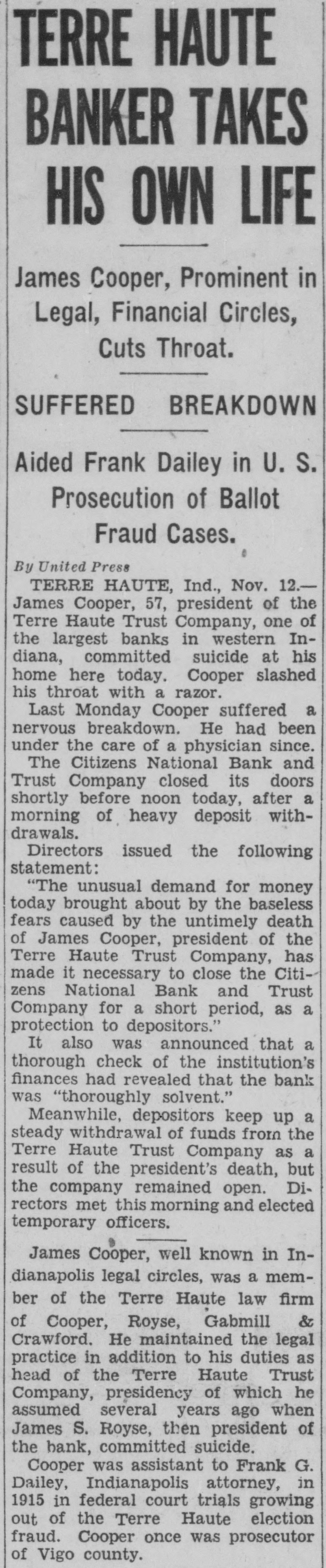 TERRE HAUTE BANKER TAKES HIS OWN LIFE James Cooper, Prominent in Legal, Financial Circles, Cuts Throat. SUFFERED BREAKDOWN Aided Frank Dailey in U. S. Prosecution of Ballot Fraud Cases. By United Press TERRE HAUTE, Ind., Nov. 12.James Cooper, 57, president of the Terre Haute Trust Company, one of the largest banks in western Indiana, committed suicide at his home here today. Cooper slashed his throat with a razor. Last Monday Cooper suffered a nervous breakdown. He had been under the care of a physician since. The Citizens National Bank and Trust Company closed its doors shortly before noon today, after a morning of heavy deposit withdrawals. Directors issued the following statement: "The unusual demand for money today brought about by the baseless fears caused by the untimely death of James Cooper, president of the Terre Haute Trust Company, has made it necessary to close the Citizens National Bank and Trust Company for a short period, as a protection to depositors." It also was announced that a thorough check of the institution's finances had revealed that the bank was "thoroughly solvent." Meanwhile, depositors keep up a steady withdrawal of funds from the Terre Haute Trust Company as a result of the president's death, but the company remained open. Directors met this morning and elected temporary officers. James Cooper, well known in Indianapolis legal circles, was a member of the Terre Haute law firm of Cooper, Royse, Gabmill & Crawford. He maintained the legal practice in addition to his duties as head of the Terre Haute Trust Company, presidency of which he assumed several years ago when James S. Royse, then president of the bank, committed suicide. Cooper was assistant to Frank G. Dailey, Indianapolis attorney, in 1915 in federal court trials growing out of the Terre Haute election fraud. Cooper once was prosecutor of Vigo county.
