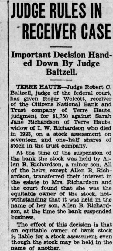 Judge Robert C. Baltzell ... has given Roger Wolcott, receiver of the Citizens National Bank and Trust company of Terre Haute, judgment for $1,750 ... At the time of the suspension of the bank the stock was held by Allen B. Richardson ...
