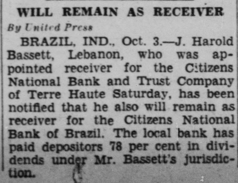 WILL REMAIN AS RECEIVER By United Press BRAZIL, IND., Oct. 3.-J. Harold Bassett, Lebanon, who was appointed receiver for the Citizens National Bank and Trust Company of Terre Haute Saturday, has been notified that he also will remain as receiver for the Citizens National Bank of Brazil. The local bank has paid depositors 78 per cent in dividends under Mr. Bassett's jurisdiction.