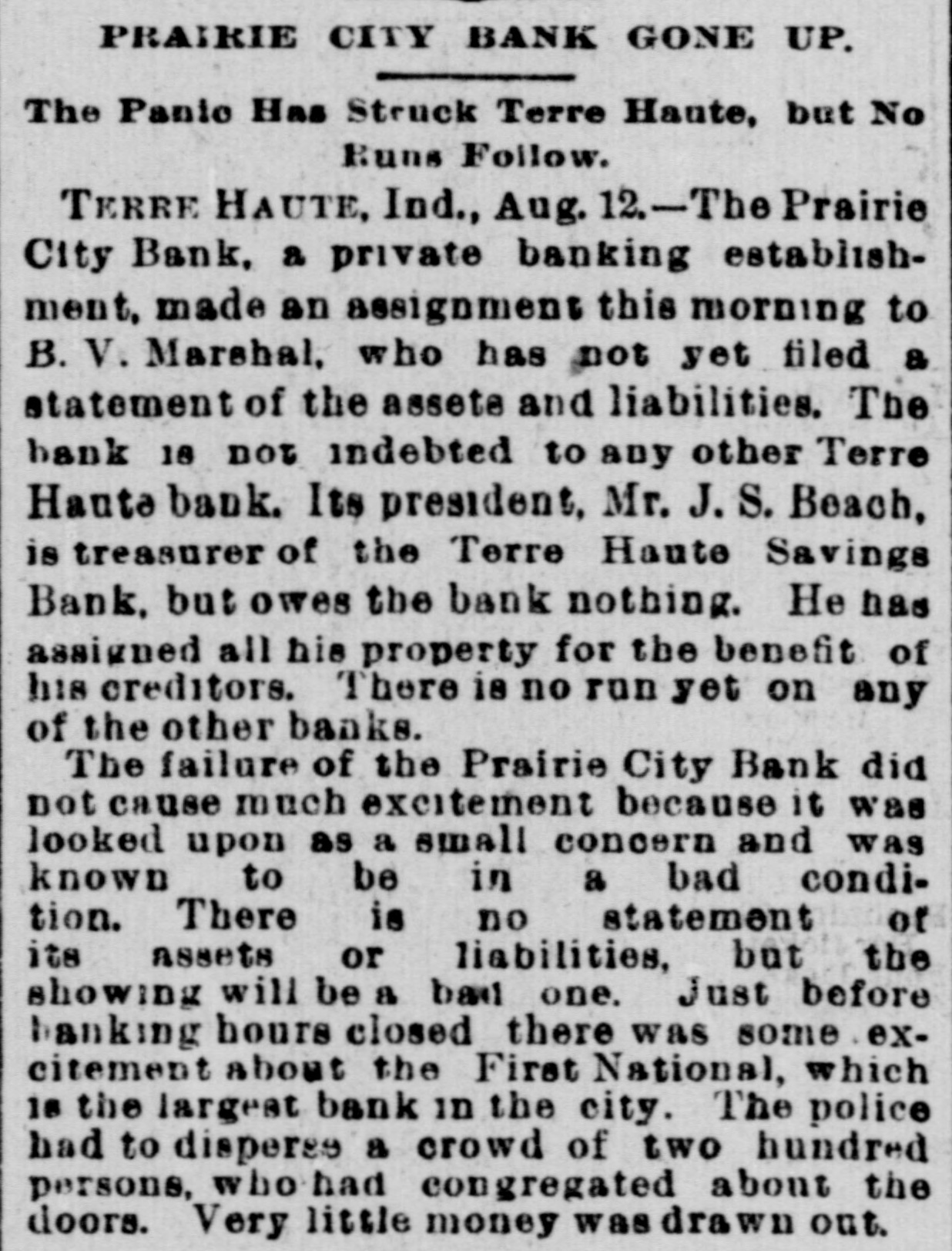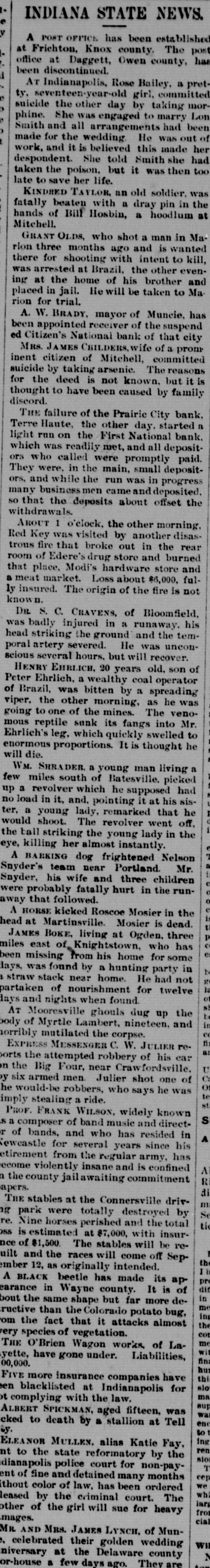 INDIANA STATE NEWS. POST OFFICE has been The established post A Frichton, Knox county. has at office at Daggett, Owen county, been discontinued. Bailey, a pret- committed morby <<<<<<<<<<<<<<<<<<<<<<<<< taking Lon She to had marry been Smith phine. and all arrangements out of for the wedding He was her made and it is believed this made had work, She told Smith she then too taken the despondent. poison, but it was late to KINDRED save her TAYLOR, life. an old soldier. in was the beaten with a dray pin hoodlum at hands fatally of Bill Hosbin, a Mitchell. OLDS, who shot a man in wanted MaGRANT three months ago and is kill, rion for shooting with intent to eventhere arrested at Brazil, the other and was the home of his brother Ma rion for trial. ing placed at in jail. He will be taken to W. BRADY, mayor of Muncie, has A. appointed receiver of the that city suspend ed been Citizen's National bank of JAMES CHILDERS,Wife of a prom committed MRS. citizen of Mitchell, reasons inent by taking arsenic. The but it is suicide the deed is not known, family for thought to have been caused by discord. failure of the Prairie City started bank, a THE Haute, the other day. bank. Terre run on the First National depositlight which was readily met, and all paid. who called were promptly depositors were, in the main, small They and while the run was in progress ors, business men came offset and deposited. the so many that the deposits about 1 withdrawals. o'clock, the other morning, disasABOUT Key was visited by another rear Red fire that broke out in the burned trous of Edere's drug store and and room Modi's hardware store fulthat place, market. Loss about $6,000. is not know a ly meat insured. The origin of the fire S. C. CRAVENS, of Bloomfield, his DR. badly injured in a runaway. temwas striking the ground and the unconhead artery severed. He was poral scious several hours, but will recover. HENRY EHRLICH. 20 years old. son of Ehrlich, a wealthy coal operator Peter Brazil, was bitten by a he spreading was of the other morning, as venoviper. to one of the mines. The Mr. going reptile sunk its fangs into to mous Ehrlich's leg. which quickly swelled he will die. enormous proportions. It is thought B Bugall ЦЕШ Sunos e SHRADER WM. miles south of Batesville, had picked few revolver which he supposed his sisan 18 1! pointing and "II u! peot E dn no young lady, remarked that off, ter. a would shoot. The revolver went in the ball striking the young lady the eye, killing her almost instantly. BARKING dog frightened Mr. Nelson A team near Portland. children Snyder's his wife and three runwere Snyder, probably fatally hurt in the away that kicked followed. Roscoe Mosier in dead. the A head at HORSE Martinsville. Mosier is three JAMES BOKE, living at Ogden, has east of Knightstown, for who some miles missing from his home in been was found by a hunting had party not days, straw stack near home. He twelve partaken of nourishment for days and nights when found. Mooresville ghouls dug up the and body AT of Myrtle Lambert, nineteen. aorribly mutilated the corpse. EXPRESS MESSENGER C. W. JULIER re- car borts the attempted robbery of his Crawfordsville. the Big Four, near one of O on six armed men. Julier shot he was 91 y he would-be robbers, who says IS e statement Alday S FRANK WILSON, widely known directPROF. composer of band music and in V a of bands, and who has resided his Sewcastle for several years since has V etirement from the regular army, confined ecome violently insane and is a the county jailawaiting commitment IF III THE apers. stables at the Connersville by drivi 11 park were totally the destroyed total ng Nine horses perished and insurre. is estimated at $7,000, with be reoss of $1,500 The stables will 41 nce uilt and the races will come off Sep11 ember 12, as originally intended. pro HP BLACK beetle has made its is ap- of up A in Wayne county. It deour bout earance the same shape but far more bug, sur 941 ructive than the Colorado potato almost om the fact that it attacks con species of vegetation. our 11 M very THE O'Brien Wagon works, of Liabilities, Lamy yette, have gone under. hut 191 OIN FIVE 00,000. more insurance companies have for ben blacklisted at Indianapolis Ins ot complying with the law. en ALBERT SPICKMAN, aged fifteen, Tell was of cked to death by a stallion at ing 194 ty. ELEANOR MULLEN, alias Katie the Fay, to the state reformatory by nt dianapolis police court for non-pay- months of fine and detained many