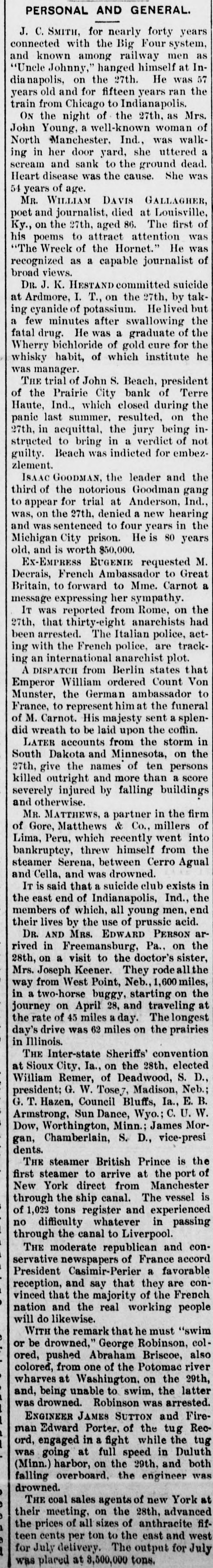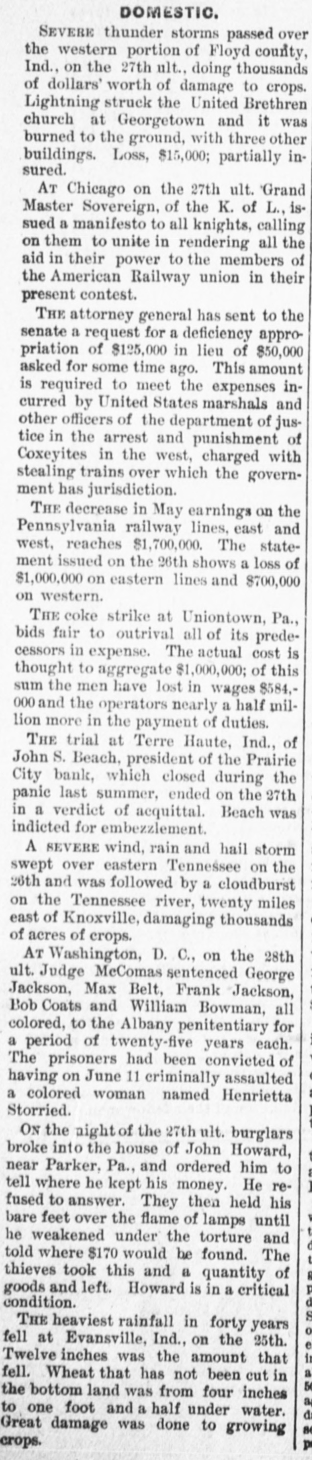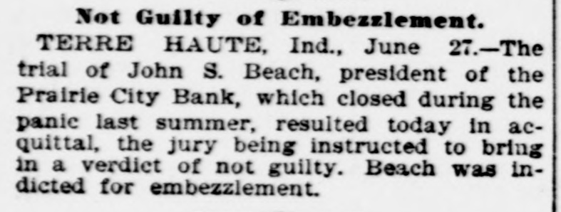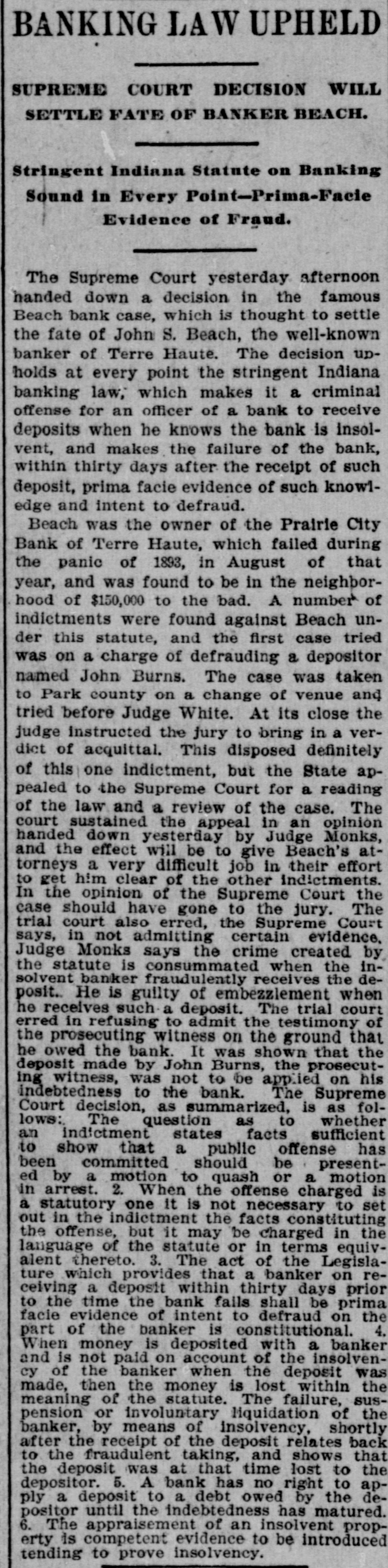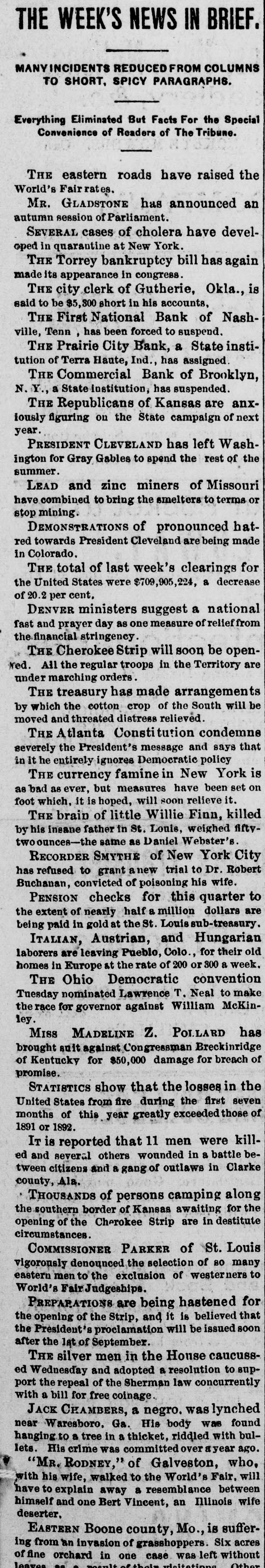 BANKS IN TROUBLE. The First National Bank or Gadaden, Ala. Suspends. GADSDEN. Aug. 12.-The First National Bank suspended payment this morning. with a capital stock of $50,000: deposits of $80,000. The directors assure depositors that they will be paid in full. MCALLISTER, I. T., Aug. 12-The South MoAllister Bank has gone into liquidation for the purpose of suspending. All depositors will be paid in full. The National Bank of Denison is winding up the affairs of the suspended bank. SAN FRANCISCO. Aug. 12.-Upon application of several creditors. Judge Garber yesterday afternoon made an order citing the Pacific Bank to show cause on Aug. 24 why it should not be adjudged insolvent. and surrender its estate for the benefit of its creditors. TERRE HAUTE. Ind.. Aug. 12.-When the banking hour came this morning the following sign was suspended in front of the Prairie City Bank: Owing to stringency in the money market this bank has gone into liquidation. The statement will soon be ready." The bank is a private concern of which John S. Beach is President. Mr. Beach assigns all his real estate in this city and in Florida to G. v. Marshall. the assignee. M. R. McKeen holds a mortgage of $50,000 on the property to secure a note drawn by Mr. Beach. Mr. Beach is treasurer of the Terre Haute Savings Bank. and his property is also subject to mortgages held by J. G. Williams. a director, to cover the money deposited with the Prairie City by the savings bark. MONTICELLO, III.. Aug. 12-The banking house of W. W. Beatty. known as the Mansfield Bank at Mansfield, III., yesterday made an assignment to A. J. Langley. whose bond was fixed at $25,000. Liabilities. $106,759: assets, $135,000. principally real estate in Platt county and Chicago. NASHVILLE, Aug. 12.-The People's Bank at Lewisburg failed to open its doors this morning. This suspension 18 due to the suspension of the First National and American National Banks of Nashville. a constant drain by de. positors. and failure to collect. The President and cashier state that the bank is in first-class condition. and they are confident that it will be able to resume in a few days or AS soon RS a meeting of the stockholders and depositors can be held. COLUMBIA, Pa.. Aug. 12.-The following notice was posted on the doors of the bank of E. K. Smith this morning: Closed for the present to liquidate." Deposits are estimated at $100,000. and it is believed depositors will be paid in full. E. K. Smith confessed judgment last night in favor of his wife in the sum of $36,167.49.