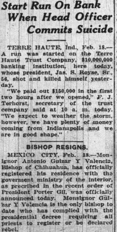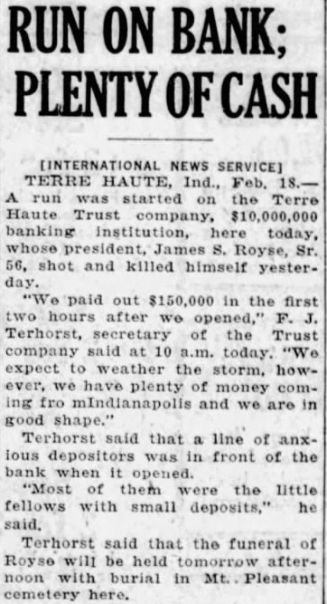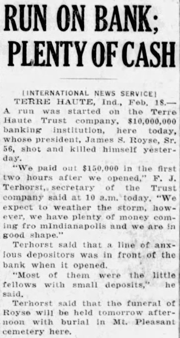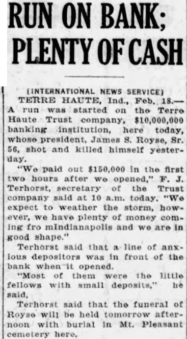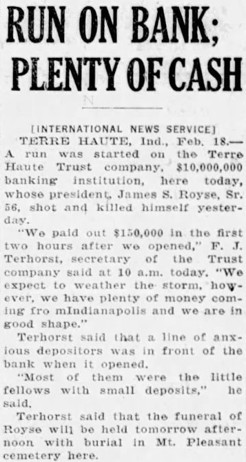 RUN ON BANK; PLENTY OF CASH TERRE HAUTE, Feb. started Terre Haute Trust company. banking here today, Sr. 56, shot killed himself yesterpaid out $150,000 in the first hours after Terhorst, secretary of the Trust company today. "We expect weather the howwe plenty money coming and we are shape." Terhorst said that line front of the bank when them the little fellows with small deposits," he Terhorst that the funeral of Royse will be afternoon burial in Mt. Pleasant cemetery here.