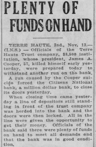 TERRE HAUTE BANKER TAKES HIS OWN LIFE James Cooper, Prominent in Legal, Financial Circles, Cuts Throat. SUFFERED BREAKDOWN Aided Frank Dailey in U. S. Prosecution of Ballot Fraud Cases. By United Press TERRE HAUTE, Ind., Nov. 12.James Cooper, 57, president of the Terre Haute Trust Company, one of the largest banks in western Indiana, committed suicide at his home here today. Cooper slashed his throat with a razor. Last Monday Cooper suffered a nervous breakdown. He had been under the care of a physician since. The Citizens National Bank and Trust Company closed its doors shortly before noon today, after a morning of heavy deposit withdrawals. Directors issued the following statement: "The unusual demand for money today brought about by the baseless fears caused by the untimely death of James Cooper, president of the Terre Haute Trust Company, has made it necessary to close the Citizens National Bank and Trust Company for a short period, as a protection to depositors." It also was announced that a thorough check of the institution's finances had revealed that the bank was "thoroughly solvent." Meanwhile, depositors keep up a steady withdrawal of funds from the Terre Haute Trust Company as a result of the president's death, but the company remained open. Directors met this morning and elected temporary officers. James Cooper, well known in Indianapolis legal circles, was a member of the Terre Haute law firm of Cooper, Royse, Gabmill & Crawford. He maintained the legal practice in addition to his duties as head of the Terre Haute Trust Company, presidency of which he assumed several years ago when James S. Royse, then president of the bank, committed suicide. Cooper was assistant to Frank G. Dailey, Indianapolis attorney, in 1915 in federal court trials growing out of the Terre Haute election fraud. Cooper once was prosecutor of Vigo county.