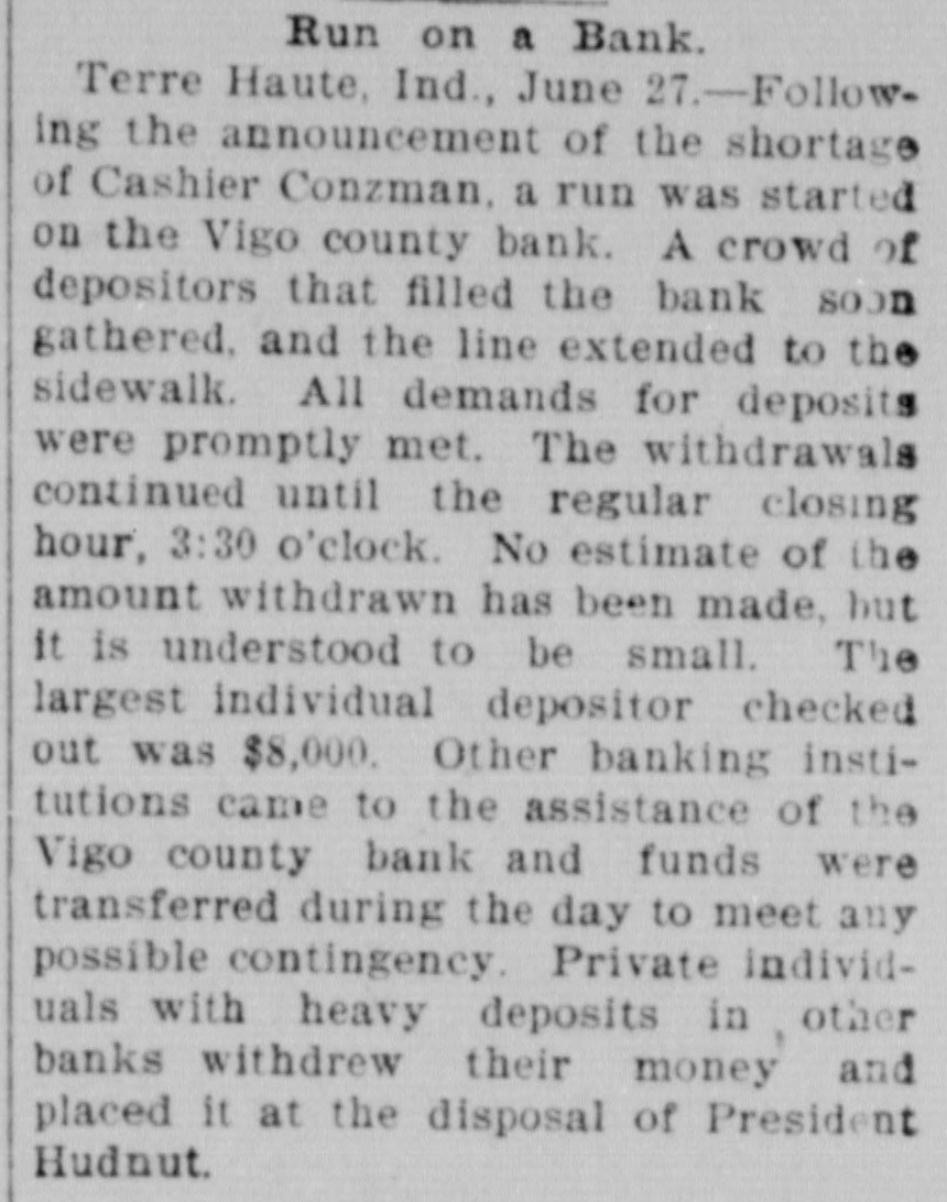 Run on a Bank. Terre Haute, Ind., June 27.-Following the announcement of the shortage of Cashier Conzman, a run was started on the Vigo county bank. A crowd of depositors that filled the bank SOOD gathered, and the line extended to the sidewalk. All demands for deposits were promptly met. The withdrawals continued until the regular closing hour, 3:30 o'clock. No estimate of the amount withdrawn has been made, but it is understood to be small. The largest individual depositor checked out was $8,000. Other banking institutions came to the assistance of the Vigo county bank and funds were transferred during the day to meet any possible contingency. Private individuals with heavy deposits in other banks withdrew their money and placed it at the disposal of President Hudnut.