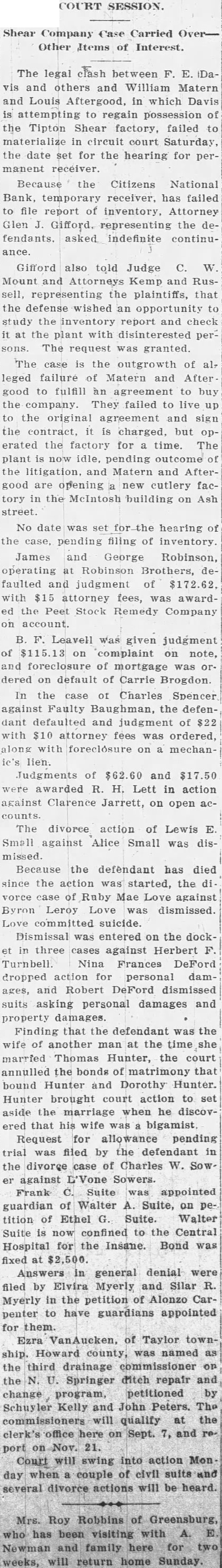 Shear Company Case Carried Other Items of Interest. The legal between and others and William Matern and Louis Aftergood, in which Davis attempting to regain possession of the Tipton Shear factory, failed to materialize in circuit court Saturday, the date set for the hearing for manent receiver. Because the Citizens National Bank, temporary receiver, has failed to file report of Attorney Glen Gifford. representing the fendants. asked indefinite continuance. Gifford also told Judge Mount and Attorneys Kemp and representing the plaintiffs, that the defense wished an the inventory report and check at the plant with disinterested The request was granted. The case the outgrowth of leged failure of Matern and good to fulfill an agreement to buy the company. They failed to live up to the original agreement and sign the contract, it is charged, but operated the factory for time. The plant now idle, pending outcome the litigation, and Matern and good are opening new cutlery tory in the McIntosh building on Ash street. No hearing of the pending filing of inventory. James and George Robinson, operating at Robinson Brothers, faulted and judgment of with attorney fees, was awardthe Peet Stock Remedy Company account. B. Leavell was given judgment of on complaint on note, and foreclosure of mortgage was ordered on default of Carrie Brogdon. In the case of Charles Spencer against Faulty Baughman, the defendefaulted and judgment of attorney fees was ordered, on mechanlien. Judgments and awarded R. H. Lett in action against Clarence Jarrett, on open counts. The divorce action of Lewis Small against Alice Small was dismissed. Because the defendant has died since the action was started, the vorce case of Ruby Mae Love against Byron Leroy Love was dismissed. Love committed suicide. Dismissal was entered on the dockin three cases against Herbert Turnbell. Nina Frances DeFord dropped action for personal damand Robert DeFord dismissed asking personal damages and property damages. Finding that the defendant the of another man at the she married Thomas Hunter, the court annulled the bonds of matrimony that bound Hunter and Dorothy Hunter. Hunter brought court action to set aside the marriage when he discovered that his wife was bigamist. Request for allowance pending trial was filed by the defendant in the divorce case of Charles W. against Sowers. Frank Suite appointed guardian of Walter A. Suite, on tition of Ethel Suite. Walter Suite is now confined to the Central Hospital for the Insane. Bond was fixed at $2,500. Answers in general denial were filed by Elvira Myerly and Silar R. Myerly in the petition of Alonzo Carto have guardians appointed penter for them. Ezra of Taylor township. Howard county, was named the third drainage commissioner on Springer ditch repair and, change program, petitioned by Kelly and John Peters. The qualify at the clerk's office here on Sept. and port 21. Court will swing into action when couple of civil day several divorce actions will be heard. Mrs. Roy Robbins of Greensburg, who has been visiting with Newman and family here two will return home Sunday.