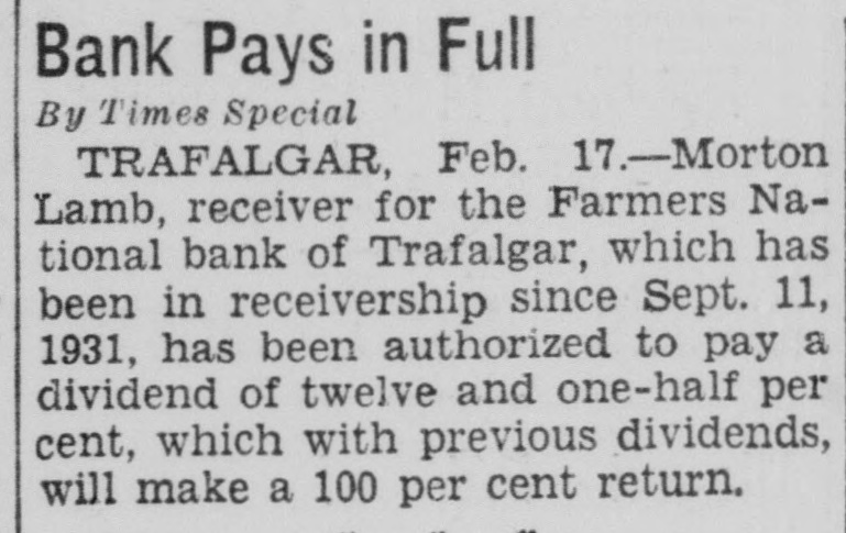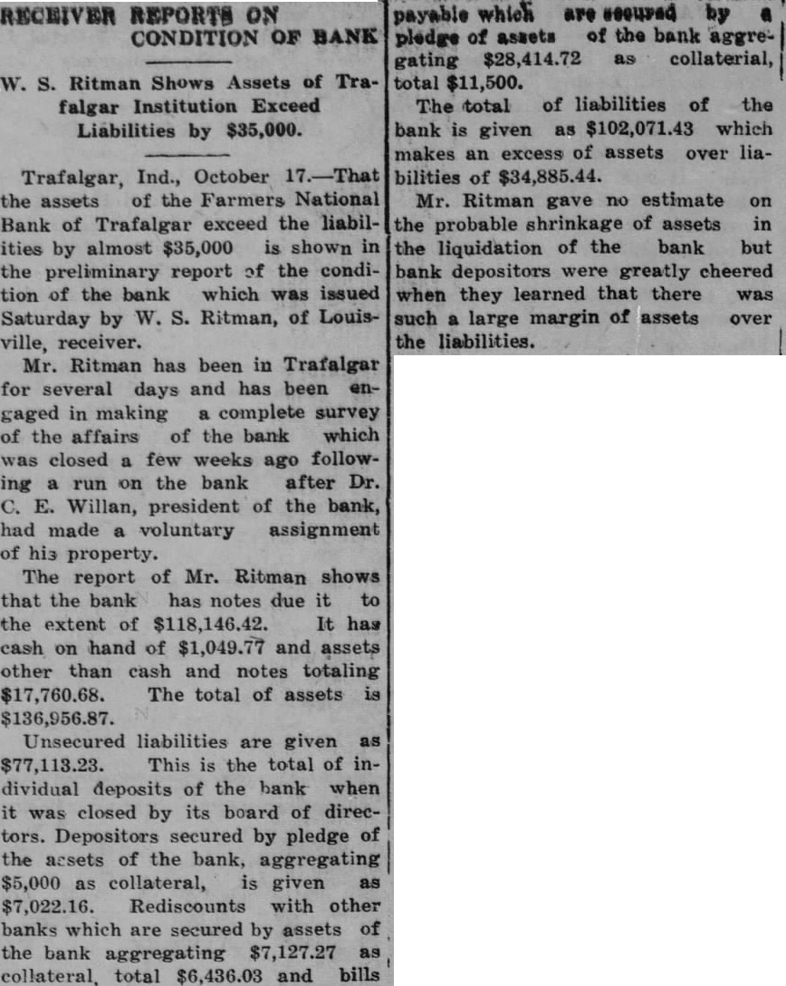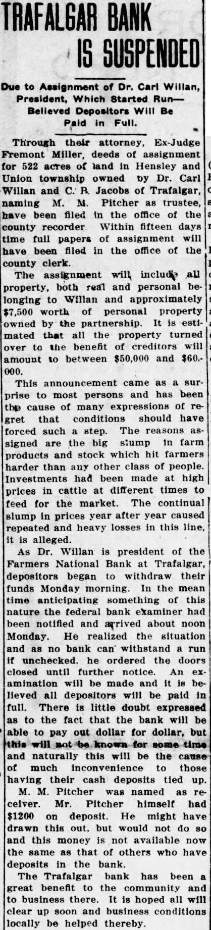 Due to Assignment of Dr. Carl Willan, President, Which Started Believed Depositors Will Be Paid Full. Through their attorney, Ex-Judge Fremont Miller, deeds of assignment for 522 acres of land in Hensley and Union township owned by Dr. Carl Willan and Jacobs of Trafalgar, naming M. M. Pitcher as trustee, have been filed in the office of the county recorder Within fifteen days time full papers of assignment will have been filed in the office of the county clerk. The assignment will include all property, both real and personal belonging to Willan and approximately $7,500 worth of personal property owned by the partnership. It is mated that all the property turned over to the benefit of creditors will amount to between $50,000 and $60.000. This announcement came as prise to most persons and has been the cause of many expressions of that conditions should have gret forced such step. The reasons signed are the big slump in farm and stock which hit farmers products harder than any other class of people. Investments had been made at high prices in cattle at different times to feed for the market. The continual slump in prices year after year caused repeated and heavy losses in this line, alleged. As Dr. Willan is president of the Farmers National Bank at Trafalgar, depositors began to withdraw their funds Monday morning. In the mean time anticipating something of this nature the federal bank examiner had been notified and arrived about noon Monday. He realized the situation and as no bank can withstand run unchecked. he ordered the doors closed until further notice. examination will be made and believed all depositors will be paid in full. There is little doubt expressed as to the fact that the bank will be able to pay out dollar for dollar, but and naturally this will be the of much inconvenience to those having their cash deposits tied up. M. M. Pitcher was named ceiver. Mr. Pitcher himself had $1200 on deposit. He might have drawn this out. but would not do so and this money is not available now the same as that of others who have deposits in the bank. The Trafalgar bank has been great benefit to the community and business there. It is hoped all will clear up soon and business conditions locally be helped thereby.