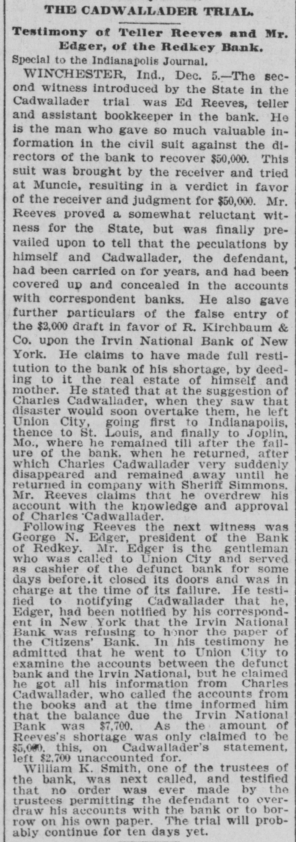 # CLEVER SHERIFF SIMMONS. Winchester Is Proud of His Work in Catching the Criminal. Special to the Indianapolis Journal. WINCHESTER, Sept. 20. -Great interest is manifested in this city over the special from Stockton, Cal., in to-day's Journal, giving an account of the clever manner in which young Sheriff Simmons, of this county, outwitted Charles Cadwallader's attorney and gave the California writ of habeas corpus the slip. Sheriff Simmons has been untiring in his efforts to locate Cadwallader and has spent considerable money in following up different false clues, but his perseverance was finally rewarded, when on Friday, Sept. 9, he received a telegram from the sheriff of San Joaquin county advising him of the arrest of a man there answering to the description of Cadwallader. On the following evening young Simmons left for Stockton, accompanied by Col. James Patchell, of Union City, who was sent by the depositors of the defunct Citizens Bank to identify Cadwallader. Cadwallader had been located in California since last summer sometime, perhaps longer, where he worked for the California Navigation and Improvement Company, of Stockton, as one of its bookkeepers, under the assumed name of E. H. Wilber. Had Simmons been a few days later he would have missed his man as Cadwallader had planned to leave for Honolulu on the next steamer due to leave for that place in a few days. Just how Sheriff Simmons finally succeeded in putting the California authorities on to his man (for he it was who did this) will not be known until he chooses to make known the fact himself. He has an older brother who had been in California for some time up to a month or two since, when he came here and has since been serving as a riding bailiff for the sheriff. Before coming here he was located at or near Stockton, and it is said he knew Cadwallader while there, and, it is believed by many, betrayed his presence. This Mr. Simmons stoutly denies, and says that at the proper time he will explain. The charge confronting young Cadwallader is that of embezzlement. Eignteen indictments were returned against him in different cases. This money was taken by him while serving in the capacity of cashier of the late Citizens' Bank, of Union City. Charles Cadwallader's connection with the bank as an alleged criminal would, most probably, never have come out but for the fact that Ed Reeves, a teller in the bank, under a promise of immunity from the prosecution, turned State's evidence against him. This evidence first came out in a suit brought by the receiver of the bank against the stockholders. In this case Reeves took the stand and recounted from beginning to end the various acts of crookedness perpetrated by himself and Cadwallader. Among other things he told about Cadwallader raising a $2 draft to $2,000. Reeves is now a resident of Union City, and will be one of the principal witnesses against his old associate.