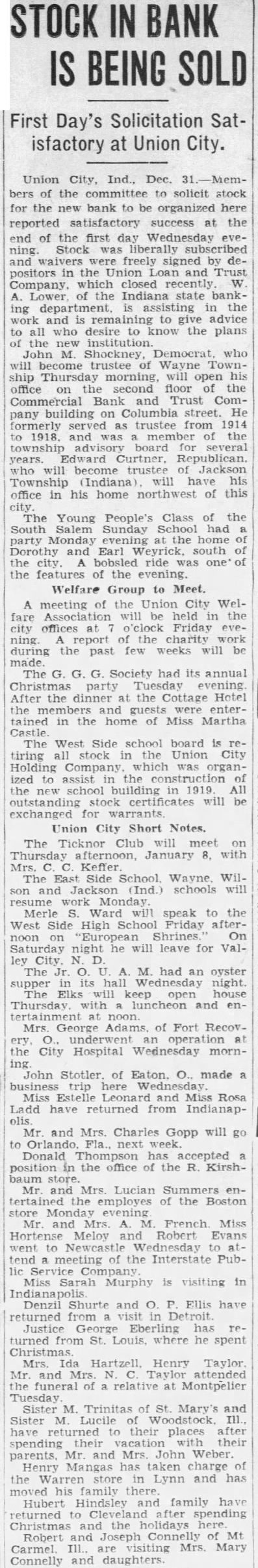 STOCK IN BANK IS BEING SOLD First Day's Solicitation Satisfactory at Union City. Union City, Ind., Dec. bers of the committee to solicit stock for the new bank to be organized here reported satisfactory success at the end of the first day Wednesday evening. Stock was liberally subscribed and freely signed by depositors in the Union Loan and Trust Company which closed recently W Lower of the Indiana state banking department. assisting in the work and remaining to give advice to all who desire to know the plans of the new John M. Shockney, Democrat. who will become trustee of Wayne Township Thursday morning, will open his office on second floor of the Commercial Bank and Trust Company building on Columbia street. He formerly served as trustee from 1914 to 1918. and was member of the township advisory board several years. Edward Curtner. Republican. who will become trustee of Jackson Township (Indiana) will have his office in his home northwest of this city The Young People's Class of the South Salem Sunday School had party Monday evening at the home Dorothy and Earl south of the city. bobsled ride one'of the features of the evening. Welfare Group to Meet. A meeting of the Union City Welfare Association be held in the city offices at o'clock Friday evening. report of the charity work during the past few weeks will be made. The G. G. G Society had its annual Christmas party evening After the dinner at the Cottage Hotel the and guests entertained in the home of Miss Martha Castle The West Side school board is retiring all stock in the Union City Holding Company which was organized to assist in the construction of the new school building in 1919 All outstanding stock certificates will be exchanged for warrants Union City Short Notes. The Ticknor Club will meet on Thursday afternoon, January 8. with Mrs. Keffer The East Side School. Wayne Wilson and (Ind.) schools will resume Monday Merle S. Ward will speak to the West Side High School Friday afternoon on "European Shrines. On Saturday night he will leave for Valley N. D. The Jr. A. M. had an oyster supper in its hall Wednesday night. The Elks will keep open house Thursday with luncheon and entertainment at noon Mrs. George Adams. of Fort Recovery. O., underwent operation at the City Hospital Wednesday morning John Stotler of Eaton. O., made trip here Miss Estelle Leonard and Miss Rosa Ladd have returned from IndianapMr. and Mrs. Charles Gopp will go to Orlando Fla., next week. Donald Thompson has accepted position in the office of the R. Kirshbaum store. Mr and Mrs. Lucian Summers entertained the employes of the Boston store Monday evening Mr and Mrs. A. French Miss Hortense Meloy and Robert Evans went to Newcastle Wednesday to tend meeting of the Interstate Public Service Company Miss Sarah Murphy is visiting in Denzil Shurte and O Ellis have returned from visit in Detroit Justice George Eberling has returned from St. Louis, where he spent Mrs. Hartzell Henry Taylor Mr. and Mrs attended the funeral of a relative at Montpelier Tuesday Sister M. Trinitas of St Mary's and Sister M. Lucile of Woodstock, Ill. have returned to their places after spending their vacation with their parents, Mr and Mrs. John Weber. Henry Mangas has taken charge of the Warren store Lynn and has moved his family there Hubert Hindsley family have returned to Cleveland after spending Christmas and the holidays here Robert and Joseph Connelly of Mt Carmel Ill., visiting Mrs. Mary Connelly and daughters