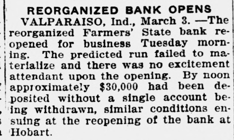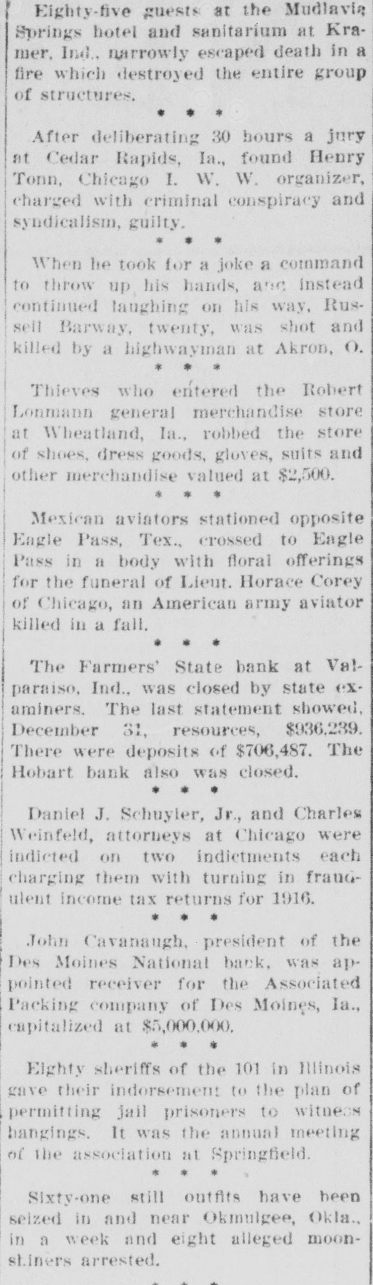 Eighty-five guests at the Mudlavia Springs hotel and sanitarium at Kramer, Ind., narrowly escaped death in a fire which destroyed the entire group of structures. ... After deliberating 30 hours a jury at Cedar Rapids, Ia., found Henry Tonn, Chicago I. W. W. organizer, charged with criminal conspiracy and syndicalism, guilty. * * * When he took for a joke a command to throw up his hands, and instead continued laughing on his way, Russell Barway, twenty, was shot and killed by a highwayman at Akron, O. ... Thieves who entered the Robert Lonmann general merchandise store at Wheatland, Ia., robbed the store of shoes, dress goods, gloves, suits and other merchandise valued at $2,500. ... Mexican aviators stationed opposite Eagle Pass, Tex., crossed to Eagle Pass in a body with floral offerings for the funeral of Lieut. Horace Corey of Chicago, an American army aviator killed in a fall. ... The Farmers' State bank at Valparaiso, Ind., was closed by state examiners. The last statement showed, December 31, resources, $936,239. There were deposits of $706,487. The Hobart bank also was closed. ... Daniel J. Schuyler, Jr., and Charles Weinfeld, attorneys at Chicago were indicted on two indictments each charging them with turning in fraudulent income tax returns for 1916. ... John Cavanaugh, president of the Des Moines National back, was appointed receiver for the Associated Packing company of Des Moines, Ia., capitalized at $5,000,000. ... Eighty sheriffs of the 101 in Illinois gave their indorsement to the plan of permitting jail prisoners to witness hangings. It was the annual meeting of the association at Springfield. .... Sixty-one still outfits have been seized in and near Okmulgee, Okla., in a week and eight alleged moonshiners arrested.