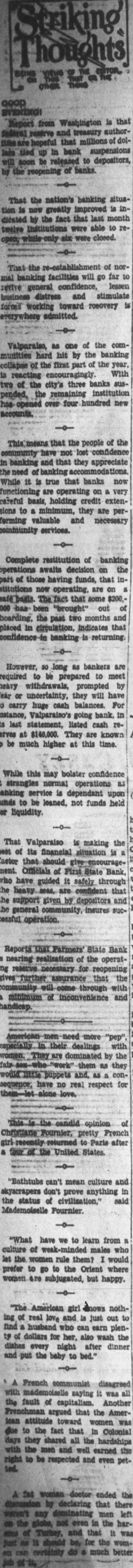authorsuspensions released depositors, That the nation's banking situagreatly diested by the last month twelve Institutions were able to reclosed. the norbanking facilities will go far general confidence, lessen business distress and stimulate forces working toward roeovery admitted. Valparaiso, one the communities hard hit by the banking collapse the first part the year, reacting encouragingly. With of the city's three banks susthe remaining institution pended, over hundred new accounts. the people the not lost confidence banking and that they appreciate While true that banks now are operating on very careful basis, holding credit extensions to minimum, they are pervaluable and necessary services. Complete restitution banking operations awaits decision on the those having funds, that stitutions now operating, are $200,been "brought" out of hoarding, the two months and placed in circulation, indicates that banking returning. However, as bankers are required to prepared to meet heavy prompted by fear uncertainty, they will have carry huge cash balances. For instance, Valparaiso's going bank. in statement, listed cash serves at $140,000. They are known much higher at this time. While this may bolster confidence strangles normal operations banking service is dependant upon funds to be not funds held for liquidity. That Valparaiso the making best of its financial situation factor ment. Officials of Bank, have guided safely through the confident that the support depositors and the general insures sucoperation. State Bank nearing of the operatreopening assurance through with and dealings with dominated by the them they consequence, have no real respect opinion pretty French returned to Paris after States. "Bathtubs can't mean culture and skyscrapers don't prove anything the status civilization," said Mademoiselle Fournier. "What have we to learn from culture of males who let the rule them? would prefer to the Orient where subjugated, but happy. American girl nothlove and just out who can earn plendollars for her, also wash the dishes every night after dinner the baby to French saying was fault Another argued that the Amertoward women was the fact that Colonial they shared all the hardships the and well earned be respected and even ended declaring that there men left the the much better