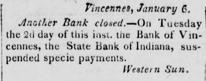 Vincennes, January 6. Another Bank closed.-On Tuesday the 2d day of this inst. the Bank of Vincennes, the State Bank of Indiana, suspended specie payments. Western Sun.
