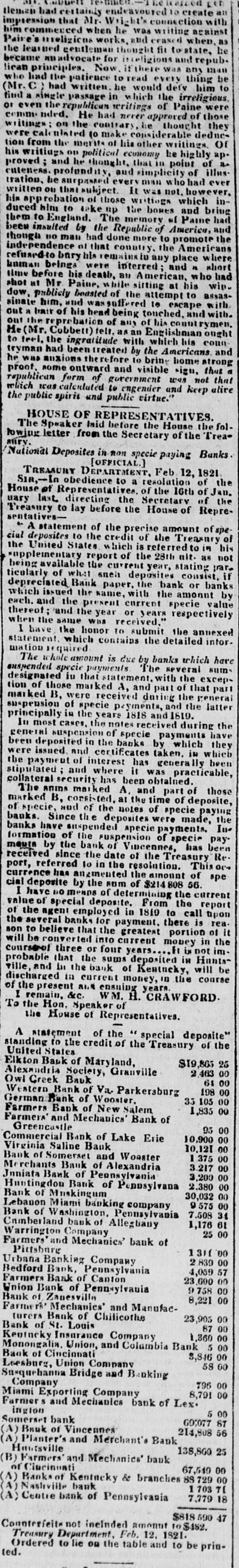 Leicarced gentleman had certainly endeavoured to create an impression that Mr. Wright's connection with him commenced when he was writing against Paine's religicus works, and ceased when, as the learned gentleman thought fit to state, he became auadvocate for itteligions and republican principles. Now, if there was any man who had the patience to read every thing be (Mr. C) had written, he would dety him to find a single passage in which the irreligious, or even the republican writings of Paine were commended. He had never approved of those writings; on the contrary, he thought they were caloniated to make considerable deduction from the merits of his other writings. Of his writings ou political economy he highly approved; and he thought, that in point of acuteness, profundity, and simplicity of illustration, he surpassed every man who had ever written on that subject. It was not, however, This approbation of those writings which induced him to take up the bones and bring them to England. The memory of Pame had been insulted by the Republic of America, aud though no man had done more to promote the independence of that country, the Americans refused to bury his remains in any place where human beings were interred; and a short time before his death, au American, who had shot at Mr. Paine, while sitting at his wipdow, publicly beasted of the attempt to assassinate him, and was suffered to escape without a hair of his head being touched, and without the reprobation of any of his countrymen. He (Mr. Cobbett) telt, as an Englishman ought to teel, the ingratitude with which his conotryman had been treated by the Americans, and he was anxions therefore to bring home strong proof, some outward and visible sigu, thut a republican form of government was not that which was calentated to engender and keep alive the public spirit and public virtue." # HOUSE OF REPRESENTATIVES. The Speaker laid before the House the fol-Powjug letter from the Secretary of the Treasury. National Deposites in non specie paying Banks. [OFFICIAL] TREASURY DEPARTMENT, Feb 12, 1821 SIR, In obedience to a resolation of the House of Representatives, of the 16th of January last, directing the Secretary of the Treasury to lay before the House of Repre-sentatives- A statement of the precise amount of special deposites to the credit of the Treasury of the United States which is referred to in his supplementary report of the 28th ult. as not being available the current year, stating par-ticularly of what snea deposites consist, if depreciated Bank paper, the bank or banks which issued the same, with the amount by each, and the present current specie value thereof; and the year or years respectively when the same was received." I have the honor to submit the annexed statement, which contains the detailed intor-mation required The whole amount is due by banks which have suspended specie payments. The several sum designated in that statement, with the excер-tion of those marked A, and part of that part marked B, were received during the generai suspension of specie peyments, and the latter principally in the years 1818 and 1819. In most cases, the notes received during the general suspension of specie payments have been deposited in the banks by which they were issued, and certificates taken, in which the payment of interest has generally been stipulated; and where it was practicable, collateral security has been obtained. The anins marked A, and part of those marked B, corsisted, at the time of deposite, of specie, aud of the notes of specie paying banks. Since the deposites were made, the banks have suspended specie payments. In-formation of the suspension of specie pay-meuts by the bank of Vincennes, has been received since the date of the Treasury Re-port, referred to in the resolution. This oc-currence has angmented the amount of spe-cial deposite by the sum of $214 808 56. I have no means of determining the current value of special deposite. From the report of the agent employed in 1810 to call tipon the several banks for payment, there is rea-son to believe that the greatest portion of it will be converted into current money in the Course of three or four years.... It is not im-probable that the sums deposited in Hunts-ville, and in the bank of Kentucky, will be discharged in current money, in the course of the present aus ensuing years. I remain, &c. WM. H. CRAWFORD. To the Hon. Speaker of the House of Representatives. A statement of the "special deposite" standing to the credit of the Treasury of the United States Elkton Bauk of Maryland, $19,865 25 Alexandria Society, Granville 2,463 00 Owl Creek Bauk 64 00 Western Bank of Va. Parkersburg 198 00 German Bank of Wooster, 35 105 00 Farmers Bank of New Salem Farmers' and Mechanics' Bank of Greencastle 1,835 00 Commercial Bank of Lake Erie 95 00 Virginia Saline Bauk 10,900 00 Bank of Somerset and Woaster 10,121 00 Merchants Bank of Alexandria 1.375 00 Juniata Bank of Pennsylvania 3.217 00 Huntingdon Bauk of Pennsylvana 3,200 00 Bank of Muskingum 2.380 00 Lebanon Miami banking company 30,032 00 Bank of Washington, Pennsylvania 9575 00 Cumberland bank of Allegtuany 7.508 34 Warrington Company 1,176 61 Farmers' and Mechanics' bank of Pittsburg 25 00 Urbana Banking Company 1311 00 Bedford Bank, Pennsylvania 2.839 00 Farmers Bank of Canton 4,059 57 Union Bank of Pennsylvania 23,600 00 Bank of Zanesville 9758 00 Farmers Mechanics' and Manufac-turers Bank of Chilicothe 8,221 00 Bank of St. Louis 23,905 00 Kentucky Insurance Company 87 00 Monongalia, Union, and Columbia Bank 1,360 00 Baok of Cincinnati 500 Leesburg, Union Company 3,846 00 Susquehanna Bridge and Banking Company 58 00 Miami Exporting Company 796 00 Farmers and Mechanics bank of Lex.ington 8,791 00 Somerset bank 500 (A) Bauk of Vincennes 69,077 87 (A) Planter's and Merchant's Bank Hautsville 214,808 56 (B) Farmers' and Mechanics' bank of Ciucinuati 138,800 25 (A) Banks of Kentucky & branches 67,549 00 (A) Nashville bank 