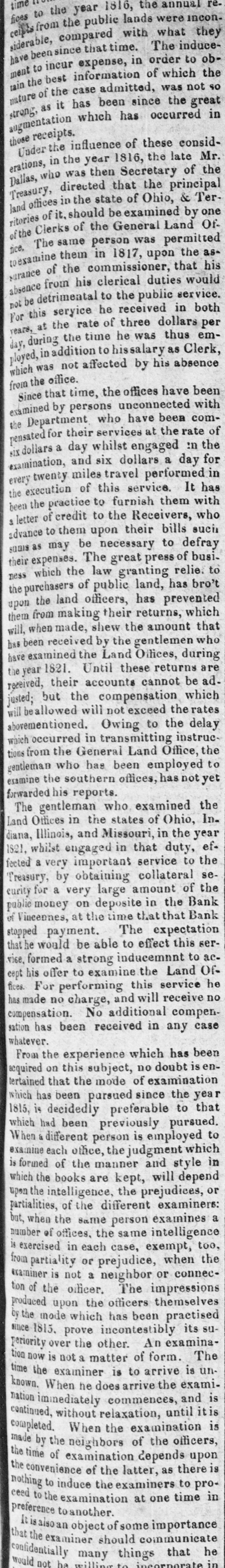 rethe the year public lands were incon- they with what expense, in order which information of not have beensing siderable, ment to compared that time. The induce- to ob- the so tain the best case admitted, was of has been since strong, as which has nature the it these occurred the consid- great in those the influence 1816, of the late Mr. in Secretary who directed that the & Tererations, Under the was year then Ohio, principal of the in the state of by one should be examined Land Ofof the General was The in 1817, upon ritories of the nce, Clerks of it. same them person permitted that the as- his toesamine the commissioner, would rurance of his clerical duties service. to the in he received absence detrimental from service public dollars both per For this rate of three thus emyears, at the time he was during addition the to hissalary as absence Clerk, which ployed, was in not affected by his from the that office. time, the offices have been with Since by persons unconnected been comexamined who have rate the services at the a day whilst engaged in and six dollars a Department for their day the for of in examination, miles travel performed every of this the execution to furnish them who twenty practice service. Receivers, It with has been the credit to the bills such letter of them upon their defray advance to be necessary to of busisumis as may The great press their expenses. which the law granting has relie. bro't to ness of public land, prevented the purchasers land officers, has which the making their returns, that made, shew the who will, them upon from gentlemen amount when received by the during has been the Land Offices, are Until these their accounts but the compensation exceed the rates will beallowed received, justed; have examined the year 1821. will not cannot returns which be delay adOwing to the instrucwhich abovementioned. from occurred the General in transmitting Land employed Office, the to tions who has been has not yet examine gentleman the southern offices, forwarded his reports. who examined the InThe gentleman the states of Ohio, Land Offices Illinois, in and Missouri, that in duty, the year efdiana, 1821, whilet engaged important in service to the feeted a very by obtaining amount collateral of the security Treasury, for a very large in the Bank public money at on the deposite time that expectation that Bank stopped would be able to effect to of Vineennes, payment. inducemnnt The this ser- Of- acthat he a strong Land vice, cept his formed offer to examine this the service he For performing will receive no no compenfices. as made charge, No additional and any case sation compensation. has been received in whatever. the experience which doubt has is been enacquired From on that this the subject, mode of no examination the year tertained has been pursued since to that which is decidedly preferable which had been person is employed to 1815, When different previously judgement pursued. which in each office, the and style books are examine of the manner will depend which intelligence, the upen the is formed the different kept, prejudices, examiners: or a partialities, of the examines but, when the same person same intelligence of offices. the exempt, too, in each when or prejudice, or is not a number from exercised partiality neighbor case, impressions connec- the ton examiner of the officer. officers The themselves produced upon the been the mode incontestibly since 1815. prove which has An practised examina- its suother. The tion periority now is over not the a matter of arrive form. is unexaminer is to he does arrive and until known. nation time the immediately When relaxation, commences, the exami- it is is is completed. continued, without When the examination of the officers, made by the neighbors depends upon the time of examination as there is the convenience of the latter, to proceed to the examination at nothing to induce the examiners one time in preference to another. importance Itisaisoan object of some communicate he that the examiner should that confidentially many things noorporate in would not ha.