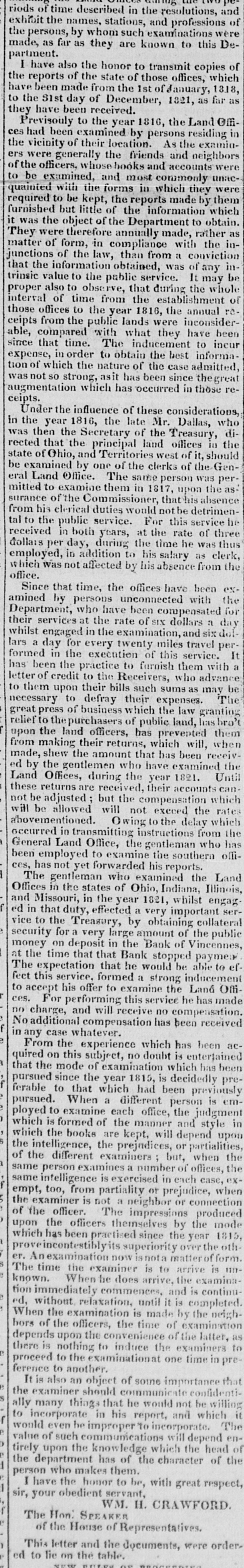 riods of time described in the resolutions, and exhibit the names, stations, and professions of the persons, by whom such examinations were made, as far as they are known to this De- partment. I have also the honor to transmit copies of the reports of the state of those offices, which have been made from the 1st of January, 1818, to the 31st day of December, 1821, as far as they have been received. Previsouly to the year 1816, the Land Offi- ces had been examined by persons residing in the vicinity of their location. As the examin- ers were generally the friends and neighbors of the officers, whose books and accounts were to be examined, and most commonly unac- quainted with the forms in which they were required to be kept, the reports made by them furnished but little of the information which it was the object of the Department to obtain. They were therefore annually made, rather as matter of form, in compliance with the in- junctions of the law, than from a conviction that the information obtained, was of any in- trinsic value to the public service. It may be proper also to observe, that during the whole interval of time from the establishment of those offices to the year 1816, the annual re- ceipts from the public lands were inconsider- able, compared with what they have been since that time. The inducement to incur expense, in order to obtain the best informa- tion of which the nature of the case admitted, was not so strong, as it has been since the great augmentation which has occurred in those re- ceipts. Under the influence of these considerations, in the year 1816, the late Mr. Dallas, who was then the Secretary of the Treasury, di- rected that the principal land offices in the state of Ohio, and Territories west of it, should be examined by one of the clerks of the Gen- eral Land Office. The same person was per- mitted to examine them in 1817, upon the as- surance of the Commissioner, that his absence from his clerical duties would not be detrimen- tal to the public service. For this service he received in both years, at the rate of three dollars per day, during the time he was thus employed, in addition to his salary as clerk, which was not affected by his absence from the office. Since that time, the offices have been ex- amined by persons unconnected with the Department, who have been compensated for their services at the rate of six dollars a day whilst engaged in the examination, and six dol- lars a day for every twenty miles travel per- formed in the execution of this service. It has been the practice to furnish them with a letter of credit to the Receivers, who advance to them upon their bills such sums as may be necessary to defray their expenses. The great press of business which the law granting relief to the purchasers of public land, has bro't upon the land officers, has prevented them from making their returns, which will, when made, shew the amount that has been receiv- ed by the gentlemen who have examined the Land Offices, during the year 1821. Until these returns are received, their accounts can- not be adjusted; but the compensation which will be allowed will not exceed the rates abovementioned. Owing to the delay which occurred in transmitting instructions from the General Land Office, the gentleman who has been employed to examine the southern offi- ces, has not yet forwarded his reports. The gentleman who examined the Land Offices in the states of Ohio, Indiana, Illinois, and Missouri, in the year 1821, whilst engag- ed in that duty, effected a very important ser- vice to the Treasury, by obtaining collateral security for a very large amount of the public money on deposit in the Bank of Vincennes, at the time that that Bank stopped paymen. The expectation that he would be able to ef- fect this service, formed a strong inducement to accept his offer to examine the Land Offi- ces. For performing this service he has made no charge, and will receive no compensation. No additional compensation has been received in any case whatever. From the experience which has been ac- quired on this subject, no doubt is entertained that the mode of examination which has been pursued since the year 1815, is decidedly pre- ferable to that which had been previously pursued. When a different person is em- ployed to examine each office, the judgment which is formed of the manner and style in which the books are kept, will depend upon the intelligence, the prejudices, or partialities, of the different examiners; but, when the same person examines a number of offices, the same intelligence is exercised in each case, ex- empt, too, from partiality or prejudice, when the examiner is not a neighbor or connection of the officer. The impressions produced upon the officers themselves by the mode which has been practised since the year 1815, prove incontestibly its superiority over the oth- er. An examination now is not a matter of form. The time the examiner is to arrive is un- known. When he does arrive, the examina- tion immediately commences, and is continu- ed, without, relaxation, until it is completed. When the examination is made by the neigh- bors of the officers, the time of examination depends upon the convenience of the latter, as there is nothing to induce the examiners to proceed to the examination at one time in pre- ference to another. It is also an object of some importance that the examiner should communicate confidenti- ally many things that he would not be willing to incorporate in his report, and which it would even be improper to incorporate. The value of such communications will depend en- tirely upon the knowledge which the head of the department has of the character of the person who makes them. I have the honor to be, with great respect, sir, your obedient servant, WM. H. CRAWFORD. The Hon. SPEAKER of the House of Representatives. This letter and the documents, were order- ed to lie on the table.
