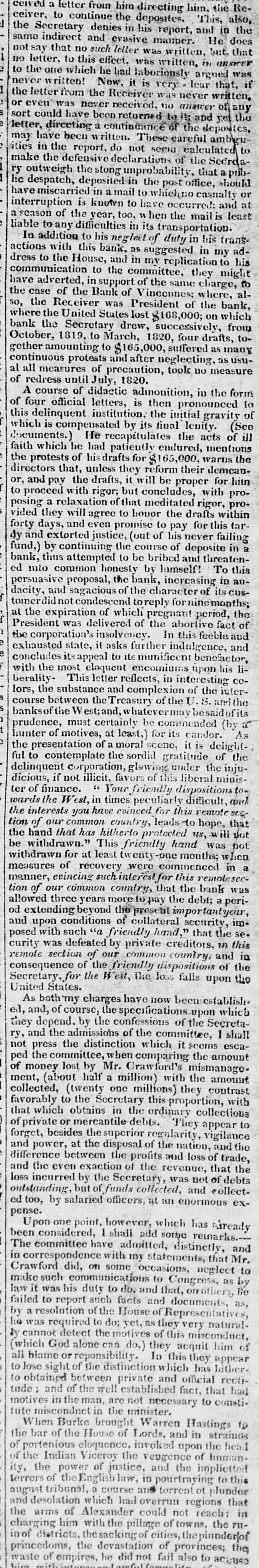 ceived a letter from him directing him, the Re- ceiver, to continue the deposites. This, also, the Secretary denies in his report, and in the same indirect and evasive manner. He does not say that no such letter was written, but, that no letter, to this effect, was written, in answer to the one which he had laboriously argued was never written! Now, it is very clear that, if the letter from the Receiver was never written, or even was never received, no answer of any sort could have been returned to its and yet the letter, directing a continuance of the deposites, may have been written. These careful ambigu- ities in the report, do not seem calculated to make the defensive declarations of the Secreda- ry outweigh the strong unprobability, that a pub- lic despatch, deposited in the post office, should have miscarried in a mail to which no casualty or interruption is known to have occurred; and at a season of the year, too, when the mail is least liable to any difficulties in its transportation. In addition to his neglect of duty in his trans- actions with this bank, as suggested in my ad- dress to the House, and in my replication to his communication to the committee, they might have adverted, in support of the same charge, to the case of the Bank of Vincennes; where, al- so, the Receiver was President of the bank, where the United States lost $168,000; on which bank the Secretary drew, successively, from October, 1819, to March, 1820, four drafts, to- gether amounting to $165,000, suffered as many continuous protests and after neglecting, as usu- al all measures of precaution, took no measure of redress until July, 1820. A course of didactic admonition, in the form of four official letters, is then pronounced to this delinquent institution, the initial gravity of which is compensated by its final lenity. (See documents.) He recapitulates the acts of ill faith which he had patiently endured, mentions the protests of his drafts for $165,000, warns the directors that, unless they reform their demean- or, and pay the drafts, it will be proper for him to proceed with rigor; but concludes, with pro- posing a relaxation of that meditated rigor, pro- vided they will agree to honor the drafts within forty days, and even promise to pay for this tar- dy and extorted justice, (out of his never failing fund,) by continuing the course of deposite in a bank, thus attempted to be bribed and threaten- ed into common honesty by himself! To this persuasive proposal, the bank, increasing in au- dacity, and sagacious of the character of its cus- tomer did not condescend to reply for nine months; at the expiration of which pregnant period, the President was delivered of the abortive fact of the corporation's insolvency. In this feeble and exhausted state, it asks further indulgence, and concludes its appeal to its munificent benefactor, with the most eloquent encomiums upon his li- berality- This letter reflects, in interesting co- lors, the substance and complexion of the inter- course between the Treasury of the U. S. and the banks of the West; and, whatever may be said of its prudence, must certainly be commended (by a hunter of motives, at least,) for its candor. As the presentation of a moral scene, it is delight- ful to contemplate the sordid gratitude of the delinquent corporation, glowing under the inju- dicious, if not illicit, favors of this liberal minis- ter of finance. "Your friendly dispositions to- wards the West, in times peculiarly difficult, and the interests you have evinced for this remote sec- tion of our common country, leads to hope, that the hand that has hitherto protected us, will not be withdrawn." This friendly hand was not withdrawn for at least twenty-one months; when measures of recovery were commenced in a manner, evincing such interest for this remote sec- tion of our common country, that the bank was allowed three years more to pay the debt; a peri- od extending beyond the present important year, and upon conditions of collateral security, im- posed with such "a friendly hand," that the se- curity was defeated by private creditors in this remote section of our common country, and in consequence of the friendly dispositions of the Secretary, for the West, the loss falls upon the United States. As both my charges have now been establish- ed, and, of course, the specifications upon which they depend, by the confessions of the Secreta- ry, and the admissions of the committee, I shall not press the distinction which it seems esca- ped the committee, when comparing the amount of money lost by Mr. Crawford's mismanage- ment, (about half a million) with the amount collected, (twenty one millions) they contrast favorably to the Secretary this proportion, with that which obtains in the ordinary collections of private or mercantile debts. They appear to forget, besides the superior regularity, vigilance and power, at the disposal of the nation, and the difference between the profits and loss of trade, and the even exaction of the revenue, that the loss incurred by the Secretary, was not of debts outstanding, but of funds collected, and collect- ed too, by salaried officers, at an enormous ex- pense. Upon one point, however, which has already been considered, I shall add some remarks. The committee have admitted, distinctly, and in correspondence with my statements, that Mr. Crawford did, on some occasions, neglect to make such communications to Congress, as by law it was his duty to do, and that, on others, he failed to report such facts and documents, as, by a resolution of the House of Representatives, he was required to do; yet, as they very natural- ly cannot detect the motives of this misconduct, (which God alone can do,) they acquit him of all blame or reponsibility. In this they appear to lose sight of the distinction which has hither- to obtained between private and official recti- tude and of the well established fact, that bad motives in the man, are not necessary to consti- tu