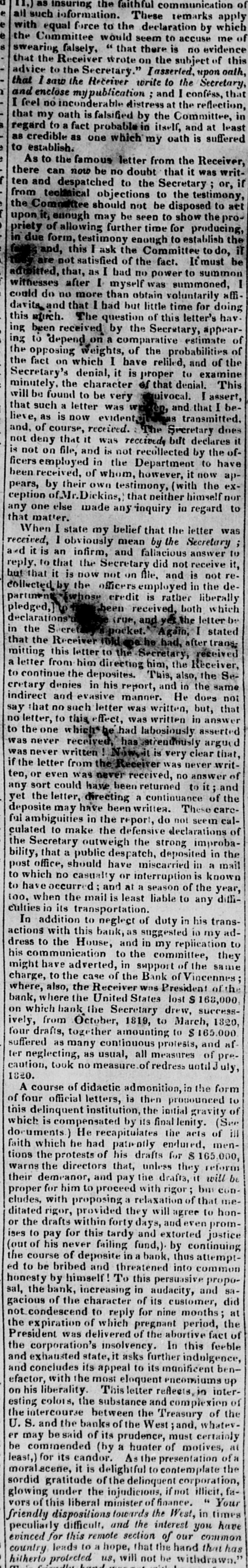 11,) as insuring the faithful communication of all such information. These remarks apply with equal force to the declaration by which the Committee would seem to accuse me of swearing falsely, "that there is no evidence that the Receiver wrote on the subject of this advice to the Secretary." I asserted, upon oath, that I saw the Receiver write to the Secretary, and enclose my publication; and I confess, that I feel no inconderable distress at the reflection, that my oath is falsified by the Committee, in regard to a fact probable in itself, and at least as credible as one which my oath is suffered to establish. As to the famous letter from the Receiver, there can now be no doubt that it was writ- ten and despatched to the Secretary; or, if from technical objections to the testimony, the Committee should not be disposed to act upon it, enough may be seen to show the pro- priety of allowing further time for producing, in due form, testimony enough to establish the fact; and, this I ask the Committee to do, if they are not satisfied of the fact. It must be admitted, that, as I had no power to summon witnesses after I myself was summoned, I could do no more than obtain voluntarily affi- davits, and that I had but little time for doing this much. The question of this letter's hav- ing been received by the Secretary, appear- ing to depend on a comparative estimate of the opposing weights, of the probabilities of the fact on which I have relied, and of the Secretary's denial, it is proper to examine minutely, the character of that denial. This will be found to be very equivocal. I assert, that such a letter was written, and that I be- lieve, as is now evident, was transmitted, and, of course, received. The Secretary does not deny that it was received, but declares it is not on file, and is not recollected by the of- ficers employed in the Department to have been received, of whom, however, it now ap- pears, by their own testimony, (with the ex- ception of Mr.Dickins,) that neither himself nor any one else made any inquiry in regard to that matter. When I state my belief that the letter was received, I obviously mean by the Secretary; and it is an infirm, and fallacious answer to reply, to that the Secretary did not receive it, but that it is now not on file, and is not re- collected by the officers employed in the de- partment whose credit is rather liberally pledged, to have been received, both which declarations are true, and yet the letter be in the Secretary's pocket. Again, I stated that the Receiver told me he had, after trans- mitting this letter to the Secretary, received a letter from him directing him, the Receiver, to continue the deposites. This, also, the Se- cretary denies in his report, and in the same indirect and evasive manner. He does not say that no such letter was written, but, that no letter, to this effect, was written in answer to the one which he had laboriously asserted was never received, has strenuously argued was never written! Now it is very clear that, if the letter from the Receiver was never writ- ten, or even was never received, no answer of any sort could have been returned to it; and yet the letter, directing a continuance of the deposite may have been written. These care- ful ambiguities in the report, do not seem cal- culated to make the defensive declarations of the Secretary outweigh the strong improba- bility, that a public despatch, deposited in the post office, should have miscarried in a mail to which no casualty or interruption is known to have occurred; and at a season of the year, too, when the mail is least liable to any diffi- culties in its transportation. In addition to neglect of duty in his trans- actions with this bank, as suggested in my ad- dress to the House, and in my replication to his communication to the committee, they might have adverted, in support of the same charge, to the case of the Bank of Vincennes; where, also, the Receiver was President of the bank, where the United States lost $ 168,000, on which bank the Secretary drew, success- ively, from October, 1819, to March, 1820, four drafts, together amounting to $ 165.000 suffered as many continuous protests, and af- ter neglecting, as usual, all measures of pre- caution, took no measure of redress until July, 1820. A course of didactic admonition, in the form of four official letters, is then pronounced to this delinquent institution, the initial gravity of which is compensated by its final lenity. (See documents.) He recapitulates the acts of ill faith which he had patiently endured, men- tions the protests of his drafts for $ 165.000, warns the directors that, unless they reform their demeanor, and pay the drafts, it will be proper for him to proceed with rigor; but con- cludes, with proposing a relaxation of that me- ditated rigor, provided they will agree to hon- or the drafts within forty days, and even prom- ises to pay for this tardy and extorted justice (out of his never failing fund,) by continuing the course of deposite in a bank, thus attempt- ed to be bribed and threatened into common honesty by himself! To this persuasive propo- sal, the bank, increasing in audacity, and sa- gacious of the character of its customer, did not condescend to reply for nine months; at the expiration of which pregnant period, the President was delivered of the abortive fact of the corporation's insolvency. In this feeble and exhausted state, it asks further indulgence, and concludes its appeal to its manificent ben- efactor, with the most eloquent encomiums up on his liberality. This letter reflects, in inter- esting colors, the substance and complexion of the intercourse between the Treasury of the U. S. and the banks of the West; and, whatev- er may be said of its prudence, must certainly be commended (by a hunter of motives, at least,) for its candor. As the presentation of a moral scene, it is delightful to contemplate the sordid gratitude of the delinquent corporation, glowing under