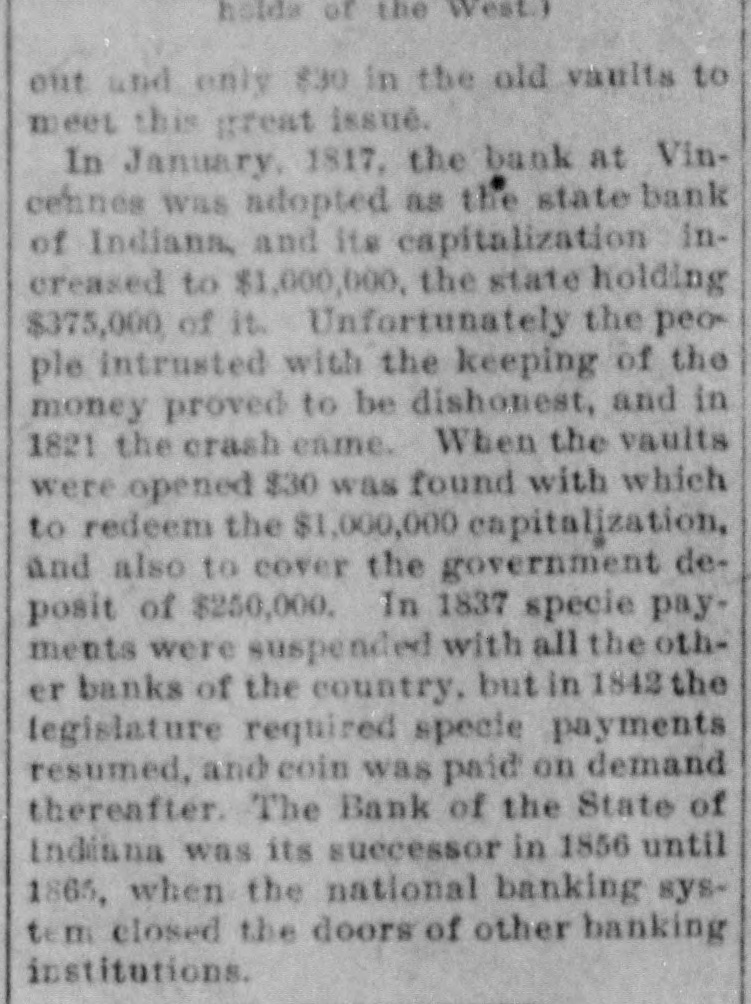 out and only $30 in the old vaults to meet this great issue. In January, 1817, the bank at Vincennes was adopted as the state bank of Indiana, and its capitalization increased to $1,000,000, the state holding $375,000 of it. Unfortunately the people intrusted with the keeping of the money proved to be dishonest, and in 1821 the crash came. When the vaults were opened $30 was found with which to redeem the $1,000,000 capitalization, and also to cover the government deposit of $250,000. In 1837 specie payments were suspended with all the other banks of the country, but in 1842 the legislature required specie payments resumed, and coin was paid on demand thereafter. The Bank of the State of Indiana was its successor in 1856 until 1865, when the national banking system closed the doors of other banking institutions.