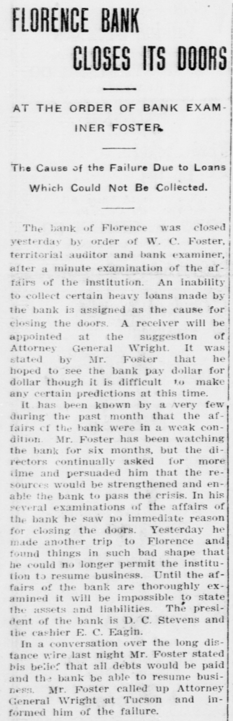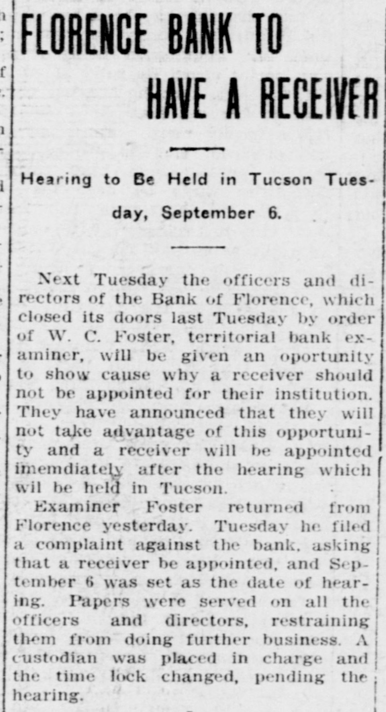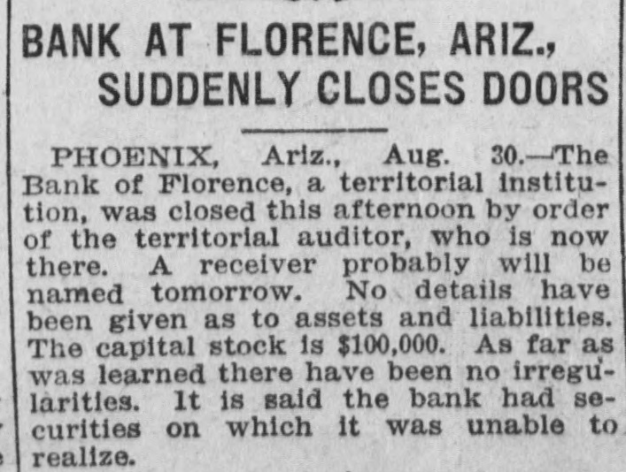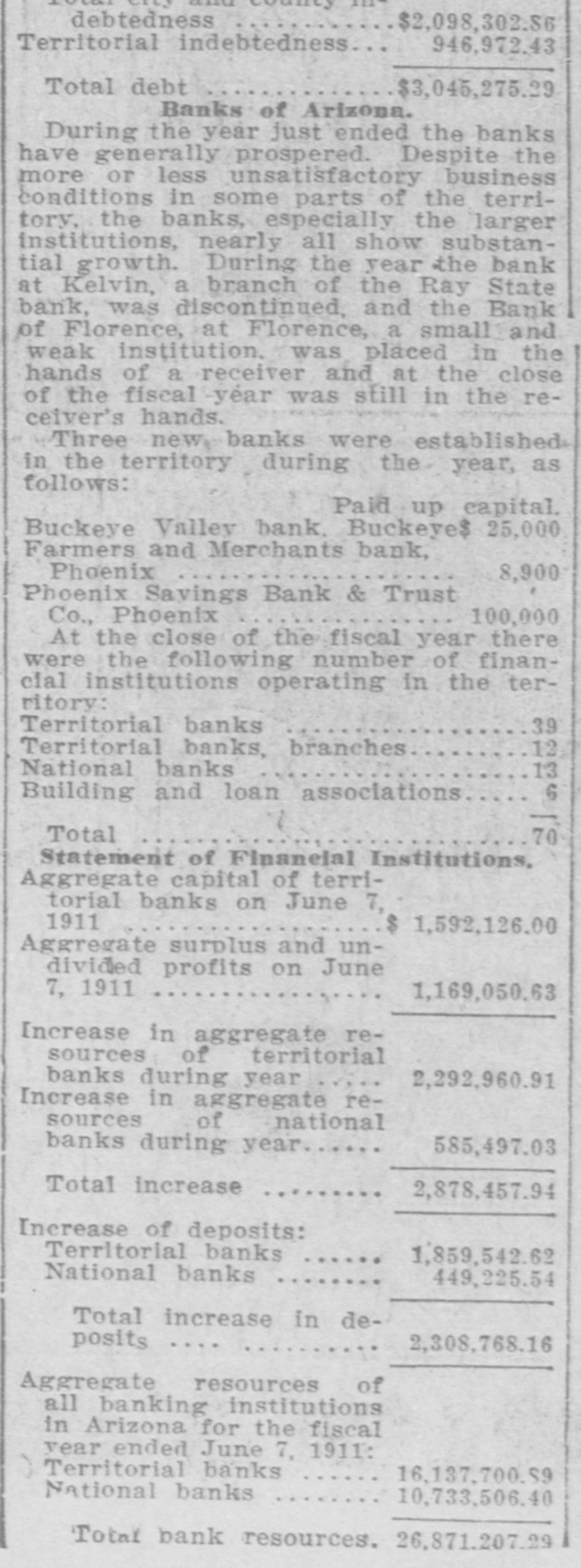 debtedness $2,098,302.86 Territorial indebtedness 946,972.43 Total debt $3,045,275.29 Banks of Arizona. During the year just ended the banks have generally prospered. Despite the more or less unsatisfactory business conditions in some parts of the territory, the banks, especially the larger institutions, nearly all show substantial growth. During the year the bank at Kelvin, a branch of the Ray State bank, was discontinued, and the Bank of Florence, at Florence, a small and weak institution, was placed in the hands of a receiver and at the close of the fiscal year was still in the receiver's hands. Three new, banks were established. in the territory during the year, as follows: Paid up capital. Buckeye Valley bank. Buckeye$ 25,000 Farmers and Merchants bank, Phoenix 8,900 Phoenix Savings Bank & Trust Co., Phoenix 100,000 At the close of the fiscal year there were the following number of financial institutions operating in the territory: Territorial banks 39 12 Territorial banks, branches National banks 13 6 Building and loan associations Total 70 Statement of Financial Institutions, Aggregate capital of territorial banks on June 7, 1911 $ 1,592,126.00 Aggregate surplus and undivided profits on June 7, 1911 1,169,050.63 Increase in aggregate resources of territorial banks during year 2,292,960.91 Increase in aggregate resources of national banks during year 585,497.03 Total increase 2,878,457.94 Increase of deposits: Territorial banks 1,859,542.62 National banks 449,225.54 Total increase in deposits 2,308,768.16 Aggregate resources of all banking institutions in Arizona for the fiscal year ended June 7, 1911: Territorial banks 16,137,700.S9 National banks 10,733,506.40 Total bank resources. 26,871,207.29