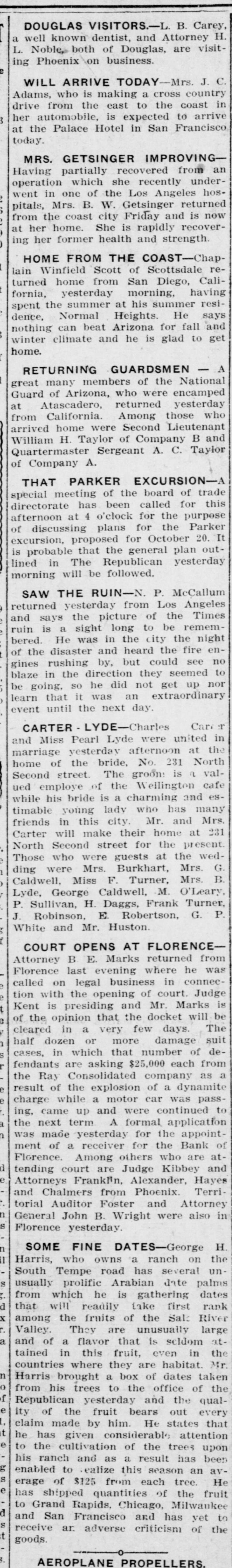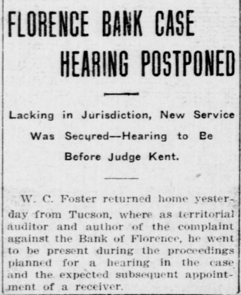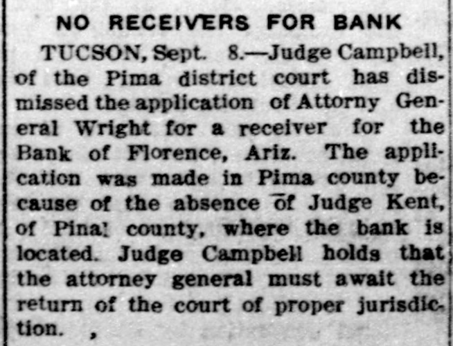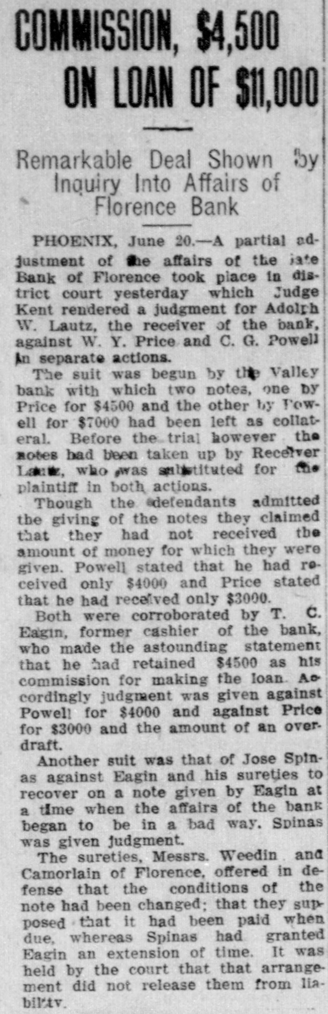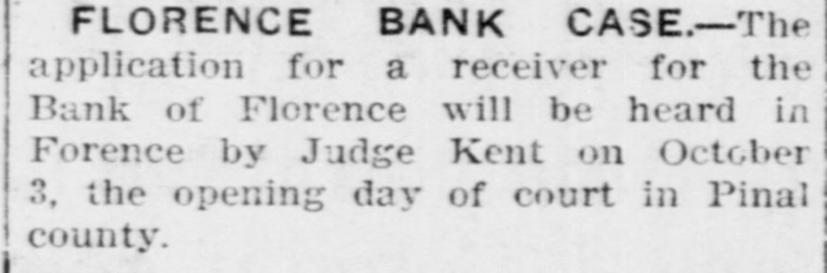 debtedness $2,098,302.86 Territorial indebtedness 946,972.43 Total debt $3,045,275.29 Banks of Arizona. During the year just ended the banks have generally prospered. Despite the more or less unsatisfactory business conditions in some parts of the territory, the banks, especially the larger institutions, nearly all show substantial growth. During the year the bank at Kelvin, a branch of the Ray State bank, was discontinued, and the Bank of Florence, at Florence, a small and weak institution, was placed in the hands of a receiver and at the close of the fiscal year was still in the receiver's hands. Three new, banks were established. in the territory during the year, as follows: Paid up capital. Buckeye Valley bank. Buckeye$ 25,000 Farmers and Merchants bank, Phoenix 8,900 Phoenix Savings Bank & Trust Co., Phoenix 100,000 At the close of the fiscal year there were the following number of financial institutions operating in the territory: Territorial banks 39 12 Territorial banks, branches National banks 13 6 Building and loan associations Total 70 Statement of Financial Institutions, Aggregate capital of territorial banks on June 7, 1911 $ 1,592,126.00 Aggregate surplus and undivided profits on June 7, 1911 1,169,050.63 Increase in aggregate resources of territorial banks during year 2,292,960.91 Increase in aggregate resources of national banks during year 585,497.03 Total increase 2,878,457.94 Increase of deposits: Territorial banks 1,859,542.62 National banks 449,225.54 Total increase in deposits 2,308,768.16 Aggregate resources of all banking institutions in Arizona for the fiscal year ended June 7, 1911: Territorial banks 16,137,700.S9 National banks 10,733,506.40 Total bank resources. 26,871,207.29