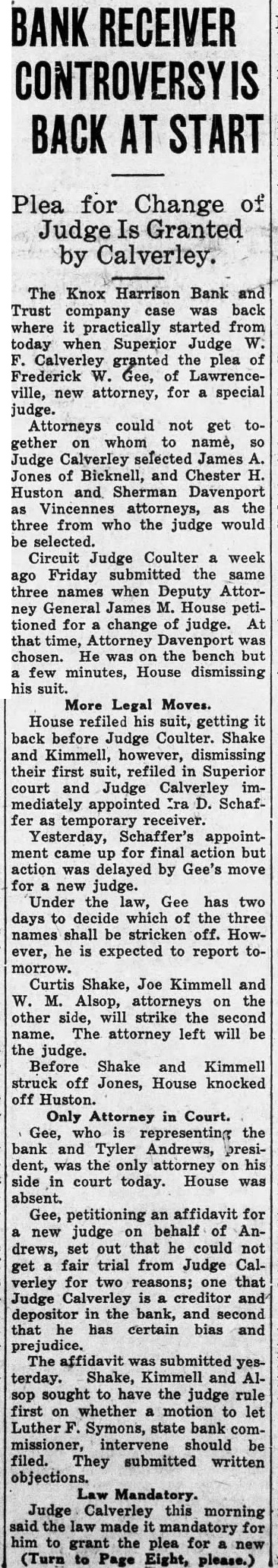 ASK PERMANENT Court Placess Schaffer in Charge of Vincennes Institution Until Monday Ira D. Schaffer. vice-president of the American National bank. was appointed temporary receiver here this afternoon for the Knox Bank and Trust company, which was closed last week by the state banking department. Appointment of Schaffer came after swift moves in the legal battle to name receiver. Two suits, one by the state bank department and another by attorneys. representing Isaac Hayes, stockholder, had been filed in separate courts. Davenport had been named special judge in the case, both sides sprang surprise by dismissing their suits and before the court adjourned, the stockholders filed new suit in superior court and Judge William F. Calverley immediately appointed Schaffer He was put under $1,000,000 permanent will be named Monday Deputy Attorney General James House, who represented the state banking department, said the court's action did not effect his pend- THERE is nothing that has ever taken the place of Bayer Aspirin as an antidote for pain. Safe, or physicians wouldn't use it, and endorse its use by others. Sure, or several million users would have turned to something else. But get real Bayer Aspirin (at any drugstore) with Bayer on the box, and the word genuine printed in