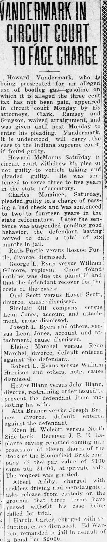 Howard Vandermark, who being prosecuted for an alleged use of bootleg gasoline on which it is alleged the three cent tax has not been paid, appeared in circuit court Monday by his attorneys, Clark, Ramsey and Grayson, waived arraignment, and was given until next Monday to enter his pleading. Vandermark, it is understood, will carry the case to the Indiana supreme court. if found guilty. Howard McManus Saturday: in circuit court withdrew his plea 01 not guilty to vehicle taking and pleaded guilty. He was sentenced to serve three to five years in the state reformatory. Charles Mominee, Saturday, pleaded guilty to, charge of passing a bad check and was sentenced to two to fourteen years in the state reformatory. Later the sentence was suspended pending good behavior, the defendant having served to date a total of six months in jail. Ruth Purtle versus Roscoe Purtle, divorce, dismissed. George L. Ryan versus William Gilmore, replevin. Court found nothing was due the plaintiff and that the defendant recover for the costs of the Opal Scott versus Hover Scott, divorce, cause dismissed. Sinclair Oil company versus Leon Jones, account and attachment, cause dismissed. Joseph L. Byers and others, versus Leon Jones, account and attachment, cause dismissed. Elaine Marchel versus Rebe Marchel, divorce, default entered against the defendant. Robert L. Evans versus William Harrison and others, note, cause dismissed. Hester Blann versus John Blann, divorce, restraining order issued't prevent the defendant from molesting his wife. Alta Bruner versus Joseph Bruner, divorce, default entered against the defendant. Eben H. Wolcott versus North Side bank. Receiver J. B. E. Laplante having reported coming into possession of eleven shares of the stock of the Bloomfield Brick compainy of the per value of $100 same ata $1100, at private sale. The request was granted. Albert Ashby, charged with reckless driving and manslaughter, asks release from custody on the grounds that three terms have passed without his case being called for trial. Harold Carter, charged with se duction, cause dismissed. Ed Warren, remanded to jail in default of a bond for $2000.