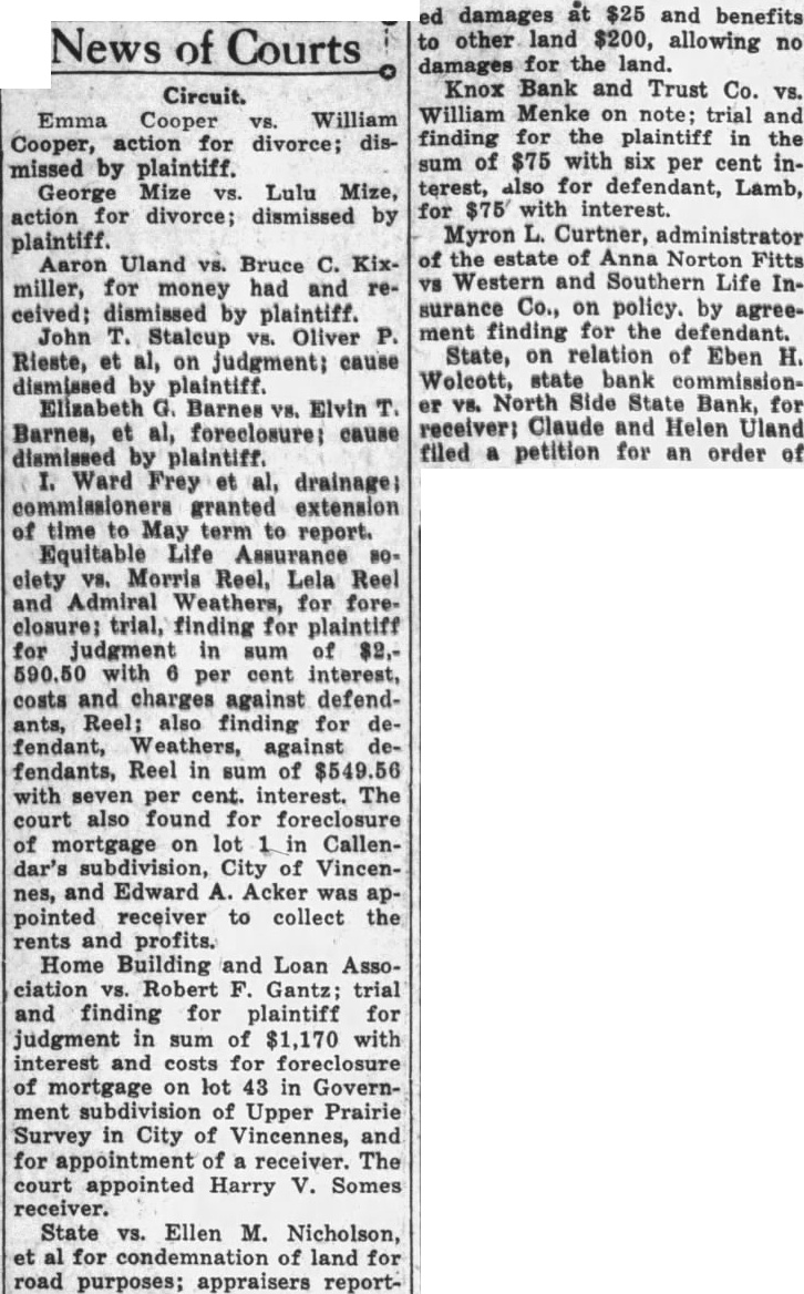 News of Courts Circuit. Emma Cooper VS. William Cooper, action for divorce; dismissed by plaintiff. George Mize vs. Lulu Mize, action for divorce; dismissed by plaintiff. Aaron Uland vs. Bruce C. Kixmiller, for money had and received: dismissed by plaintiff. John T. Staleup vs. Oliver P. Rieste, et al, on judgment; cause dismissed by plaintiff. Elizabeth G. Barnes vs. Elvin T. Barnes, et al, foreclosure; cause dismissed by plaintiff. I. Ward Frey et al, drainage; commissioners granted extension of time to May term to report. Equitable Life Assurance NOelety vs. Morris Reel, Lela Reel and Admiral Weathers, for foreclosure; trial, finding for plaintiff for judgment in sum of $2,590.50 with 6 per cent interest, costs and charges against defendants, Reel; also finding for defendant, Weathers, against defendants, Reel in sum of $549.56 with seven per cent. interest. The court also found for foreclosure of mortgage on lot 1 in Callendar's subdivision, City of Vincennes, and Edward A. Acker was appointed receiver to collect the rents and profits. Home Building and Loan Association vs. Robert F. Gantz; trial and finding for plaintiff for judgment in sum of $1,170 with interest and costs for foreclosure of mortgage on lot 43 in Government subdivision of Upper Prairie Survey in City of Vincennes, and for appointment of a receiver. The court appointed Harry V. Somes receiver. State vs. Ellen M. Nicholson, et al for condemnation of land for road purposes; appraisers report- ed damages at $25 and benefits to other land $200, allowing no damages for the land. Knox Bank and Trust Co. VS. William Menke on note; trial and finding for the plaintiff in the sum of $75 with six per cent interest, also for defendant, Lamb, for $75 with interest. Myron L. Curtner, administrator of the estate of Anna Norton Fitts vs Western and Southern Life Insurance Co., on policy. by agreement finding for the defendant. State, on relation of Eben H. Wolcott, state bank commissioner vs. North Side State Bank, for receiver; Claude and Helen Uland filed a petition for an order of