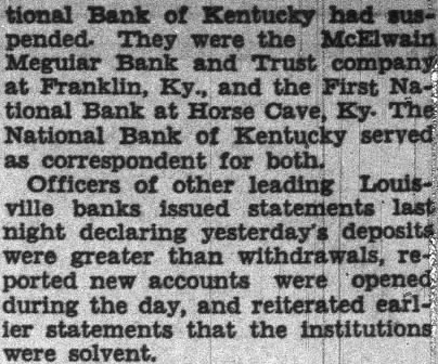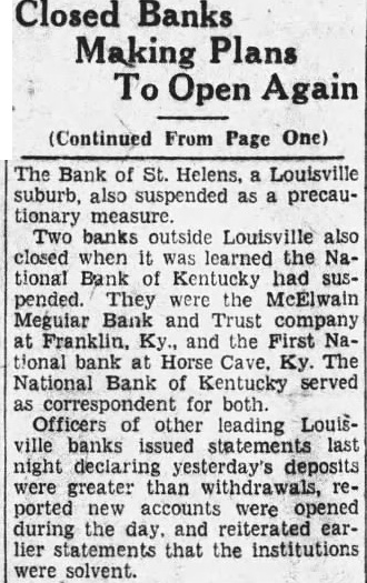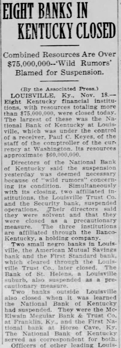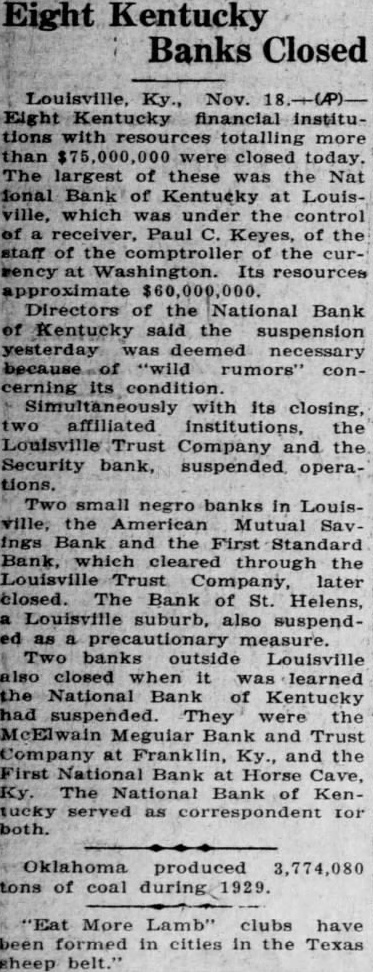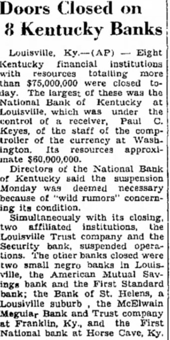 Doors Closed on 8 Kentucky Banks Louisville, Ky.-(AP) Eight Kentucky financial institutions with resources totalling more than $75,000,000 were closed today. The largest of these was the National Bank of Kentucky at Louisville, which was under the control of a receiver, Paul C. Keyes, of the staff of the comptroller of the currency at Washington. Its resources approximate $60,000,000. Directors of the National Bank of Kentucky said the suspension Monday was deemed necessary because of "wild rumors" concerning its condition. Simultaneously with its closing. two affiliated institutions, the Louisville Trust company and the Security bank. suspended operations. The other banks closed were two small negro banks in Louisville, the American Mutual Savings bank and the First Standard bank; the Bank of St. Helens, a Lousiville suburb the McElwain Megular Bank and Trust company at Franklin, Ky., and the First National bank at Horse Cave, Ky.