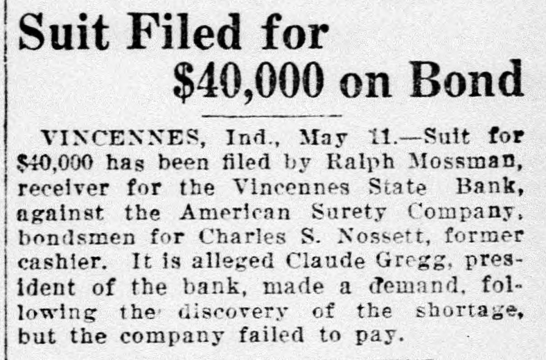 Suit Filed for $40,000 on Bond VINCENNES, Ind., May 11.-Suit for $40,000 has been filed by Ralph Mossman, receiver for the Vincennes State Bank, against the American Surety Company, bondsmen for Charles S. Nossett, former cashier. It is alleged Claude Gregg, president of the bank, made a demand, following the discovery of the shortage, but the company failed to pay.