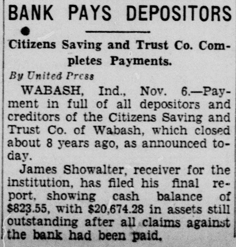 BANK PAYS DEPOSITORS Citizens Saving and Trust Co. Completes Payments. By United Press WABASH, Ind., Nov. 6.-Payment in full of all depositors and creditors of the Citizens Saving and Trust Co. of Wabash, which closed about 8 years ago, as announced today. James Showalter, receiver for the institution, has filed his final report, showing cash balance of $823.55, with $20,674.28 in assets still outstanding after all claims against the bank had been paid.