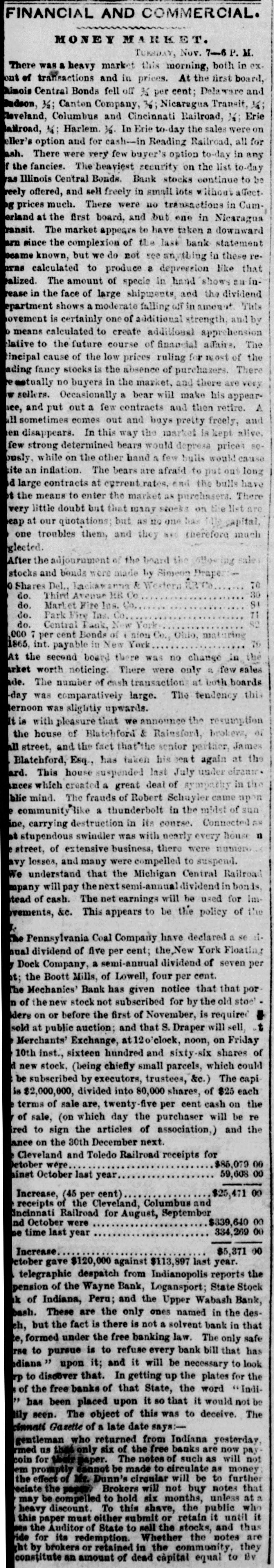 FINANCIAL AND COMMERCIAL. MONEY MARKET. TURSDAY, Nov. 7-6 P. M. There was a heavy market this morning, both in exont of transactions and in prices. At the first board, Rimois Central Bonds fell off % per cent; Delaware and Budson, 3/2; Canton Company, %; Nicaragua Transit, 1/4; Reveland, Columbus and Cincinnati Railroad, 16; Erie allroad, %; Harlem. 1/2. In Erie to-day the sales were on eller's option and for cash-in Reading Railroad, all for ash. There were very few buyer's option to-day in any f the fancies. The heaviest security on the list to-day ras Illinois Central Bonds. Bank stocks continue to be reely offered, and sell freely in small lots Rithout affect. Pg prices much. There were no transactions in Cumerland at the first board, and but one in Nicaragua ransit. The market appears to have taken a downward arn since the complexion of the last bank statement scame known, but we do not see anything in these rearns calculated to produce a depression like that ralized. The amount of specie in hand shows on inrease in the face of large shipments, and the dividend epartment shows a moderate falling off in amount This ovement is certainly one of additional strength, and by means calculated to create additional apprehension lative to the future course of financial afairs. The fincipal cause of the low prices ruling for most of the ading fancy stocks is the absence of purchasers. There tually no buyers in the market, and there are very w sellers. Occasionally a bear will make his appearnee, and put out a few contracts and then retire. A all sometimes comes out and buys pretty freely, and en disappears. In this way the market is kept alive. few strong determined bears would depress prices soously, while on the other hand a few bulls would cause tite an inflation. The bears are afraid to put out long d large contracts at currentrates. and the bulls have t the means to enter the market as purchasers. There very little doubt but that many stocks on the list are eap at our quotations; but as no one has Tale capital, one troubles them, and they *** therefore much glected. After the adjournment of the board the ing sales stocks and bonds were made by Sinson Drape: 70 Shares Del., Lackaw & Western 30 do. Third Avenue MR Co St do. Market Fire Ins. Co, 71 do. Park Fire Ins. Co. 82 do. Central Bank, New York 000 7 per cent Bonds of nion Co., Ohio, maturing 70 1865, int. payable in New York At the second board there was no change in the arket worth noticing. There were only 2 few sales ade. The number of cash transaction at both boards -day was comparatively large. The tendency this ternoon was slightly upwards. It is with pleasure that we announce the resumption the house of Blatchford & Rainsford, brokers, of all street, and the fact that'the senior partier, James Blatchford, Esq., has taken his eat again at the ard. This house suspended last July under elvenic. inces which created a great deal of sympathy in the blie mind. The frauds of Robert Schuyler came upon community like a thunderbolt in the midst of sun ine, carrying destruction in its course. Connected AN at stupendous swindler was with nearly every house n street, of extensive business, there were numero avy losses, and many were compelled to suspend. We understand that the Michigan Central Railroad mpany will pay the next semi-annual dividend in bon tead of cash. The net earnings will be used for Imovements, &c. This appears to be the policy of the The Pennsylvania Coal Company have declared a se it. nual dividend of five per cent; the,New York Floating Dock Company, a semi-annual dividend of seven per at; the Boott Mills, of Lowell, four per cent. The Mechanics' Bank has given notice that that porn of the new stock not subscribed for by the old stoc' ders on or before the first of November, is required sold at public auction; and that S. Draper will sell, Merchants' Exchange, at 12 o'clock, noon, on Friday 10th inst., sixteen hundred and sixty-six shares of d new stock, (being chiefly small parcels, which could be subscribed by executors, trustees, &c.) The capi is $2,000,000, divided into 80,000 shares, of $25 each terms of sale are, twenty-five per cent cash on the of sale, (on which day the purchaser will be re red to sign the articles of association,) and the ance on the 30th December next. Cleveland and Toledo Railroad receipts for $85,079.00 Detober were 59,608 00 ainst October last year Increase, (45 per cent) $25,471.00 receipts of the Cleveland, Columbus and incinnati Railroad for August, September nd October were $339,640.00 334,269 00 ne time last year Increase. $5,371 00 October gave $120,000 against $113,897 last year. telegraphic despatch from Indianopolis reports the pension of the Wayne Bank, Logansport; State Stock ik of Indiana, Peru; and the Upper Wabash Bank, bash. These are the only ones named in the deseh, but the fact is there is not a solvent bank in that te, formed under the free banking law. The only safe rse to pursue is to refuse every bank bill that has adiana " upon it; and it will be necessary to look FP to discover that. In getting up the plates for the of the free banks of that State, the word Indi" has been placed upon it so that it would not be lily seen. The object of this was to deceive. The cinnati Gazette of a late date says:gentleman who returned from Indiana yesterday, rmed us only six of the free banks are now pay coin for paper. The notes of such as will not em promptly cannot be made to circulate as money