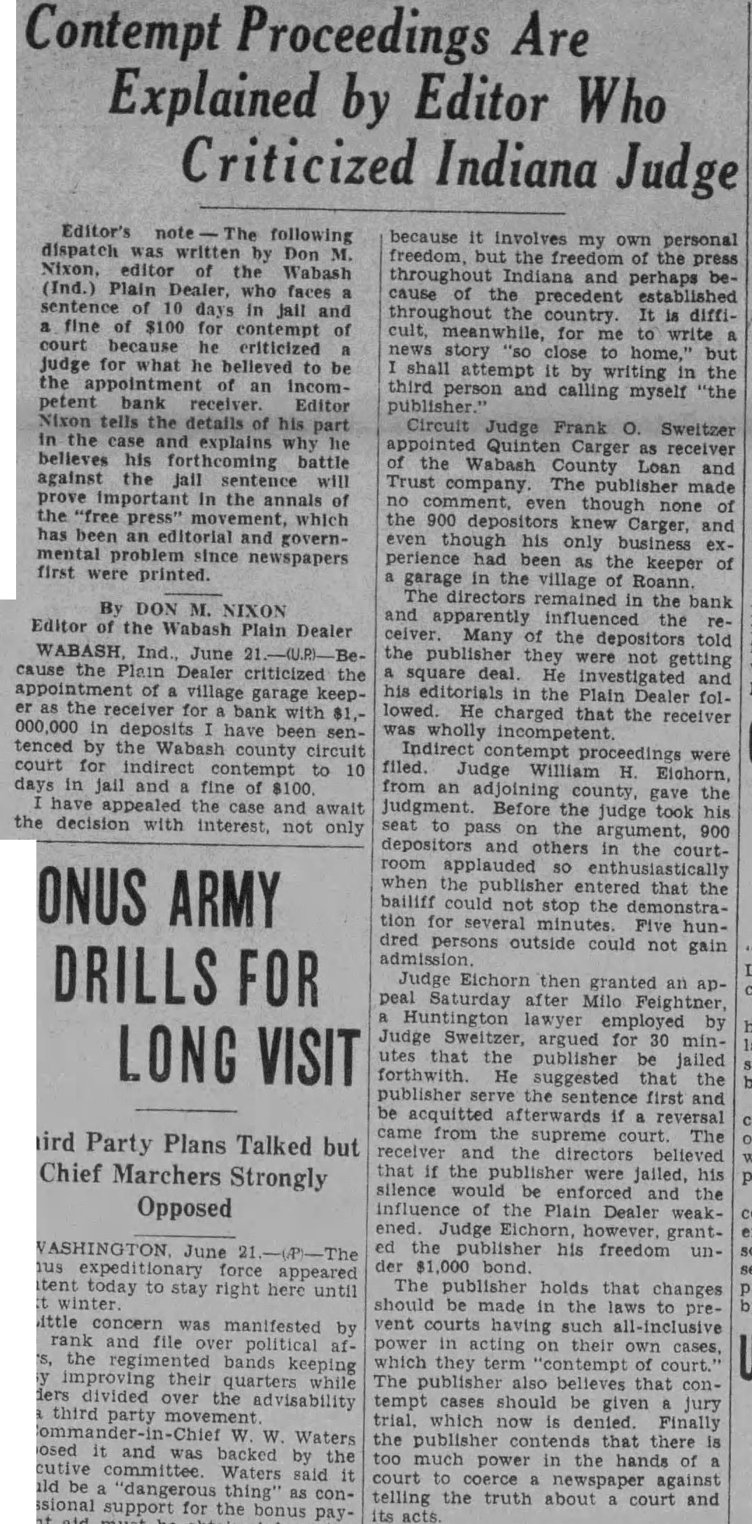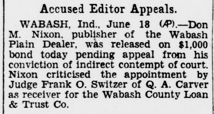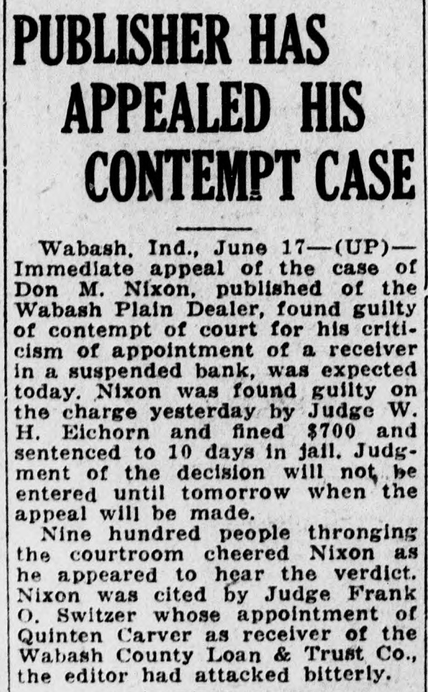EDITOR FIGHTS CONVICTION IN CONTEMPT SUIT Wabash Publisher Battles for Freedom of Press in Indiana. By United Press WABASH, Ind., June 20.-Don M. Nixon, fighting editor of the Wabash Plain Dealer, today said he would push his appeal of a contempt of court citation to the highest courts in what he believes is a struggle to preserve freedom of the press. Nixon was sentenced to ten days in jail and fined $100 for his criticism of a court's appointment of a receiver for a suspended bank. "To much power is in the hands of courts to coerce a publisher against telling the truth about a court and its acts," said Nixon. "The courts have what no one has the right to deny-trial by jury. "Changes in the law should be made to prevent courts having unreasonable power in acting in cases which they term 'contempt of court.' Such cases should be tried by juries." Fights for Freedom Nixon explained his sentence resulted from criticism of the appointment of a former garage keeper and farmer as receiver for a bank which failed with $1,000,000 in deposits. "I appealed the case," said Nixon, "not only because it involves my personal freedom, but because the freedom of the press throughout Indiana is at stake." The appointment under attack by Nixon was that of Quinten Carver, named by Circuit Judge Frank O. Sweitzer as receiver of the Wabash County Loan and Trust Company. "At the time of the appointment," Nixon said, "I made no comment, even though none of the 900 depositors knew Carver and even though his only business experience had been as a garage owner in a village of 400 population. Citizens Cheer Editor "But the bank's directors remained about the institution and apparently influenced the receiver. Depositors told me they were not getting a square deal. After an investigation, the Plain Dealer editorials appeared, charging the receiver was incompetent." The editor was cited for indirect contempt and Judge William H. Eichorn pronounced judgment. Hundreds of depositors and citizens cheered the appearance of the publisher in the courtroom. An attempt to force Nixon to serve his jail sentence prior to a decision on the appeal was forestalled.