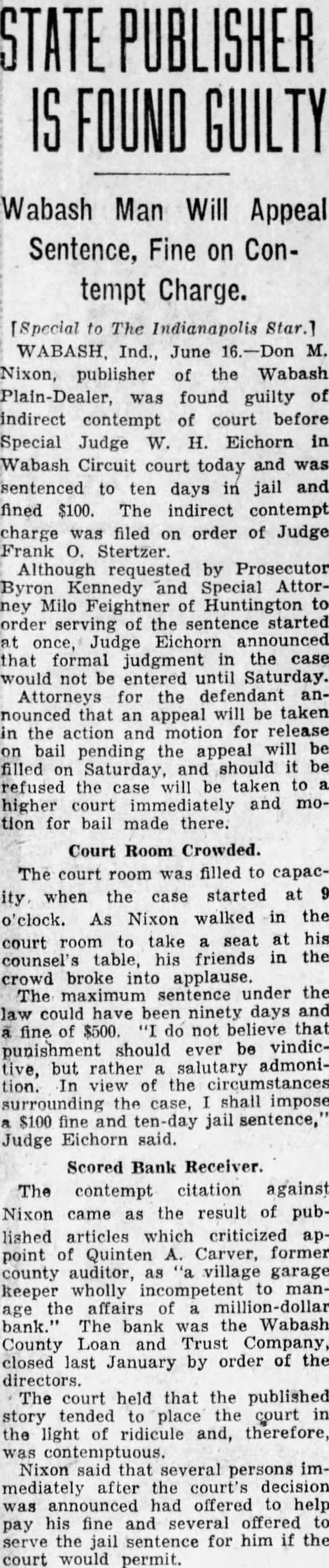 [Special to The Indianapolis Star.] WABASH, Ind., June 16.-Don M. Nixon, publisher of the Wabash Plain-Dealer, was found guilty of indirect contempt of court before Special Judge W. H. Eichorn in Wabash Circuit court today and was sentenced to ten days in jail and fined $100. The indirect contempt charge was filed on order of Judge Frank O. Stertzer Although requested by Prosecutor Byron Kennedy and Special Attorney Milo Feightner of Huntington to order serving of the sentence started at once, Judge Eichorn announced that formal judgment in the case would not be entered until Saturday. Attorneys for the defendant announced that an appeal will be taken in the action and motion for release on bail pending the appeal will be filled on Saturday, and should it be refused the case will be taken to higher court immediately and motion for bail made there.