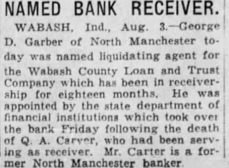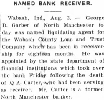Wabash, Ind., Aug. 3. - George D. Garber of North Manchester today was named liquidating agent for the Wabash County Loan and Trust Company which has been in receivership for eighteen months. He was appointed by the state department of financial institutions which took over the bank Friday following the death of Q A. Carter, who had been serving as receiver. Mr. Carter is a former North Manchester banker.