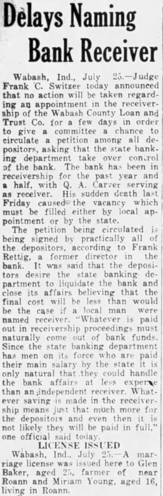 Wabash, Ind., July 25.-Judge Frank C. Switzer today announced that no action will be taken regarding an appointment in the receivership of the Wabash County Loan and Trust Co. for a few days in order to give a committee chance to circulate a petition among all depositors, asking that the state banking department take over control of the bank The bank has been in receivership for the past year and half. with Q. A. Carver serving as receiver. His sudden death last Friday caused the vacancy which must be filled either by local appointment or by the state. The petition being circulated being signed by practically all of the depositors, according to Frank Rettig, a former director in the bank. It was said that the depositors desire the state banking department to liquidate the bank and close its affairs believing that the final cost will be less than would be the case if local man were named receiver. Whatever is paid out in receivership proceedings must naturally come out of bank funds. Since the state banking department has men on its force who are paid their main salary by the state only natural that they could handle the bank affairs at less expere than an independent receiver Whatever saving is made in the receivership means just that much more for the depositors and even then not likely they will be paid in full." one official said today Wabash, Ind., July A marriage license was issued here to Glen Baker, aged 25. farmer of near Roann and Miriam Young. aged 16, living in Roann.